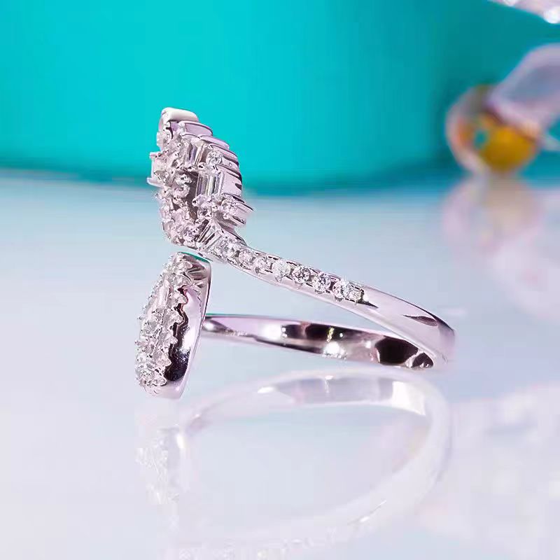 纯18K金镶嵌美国进口D色莫桑石羽翼满钻水滴开口戒指可调节送女友
