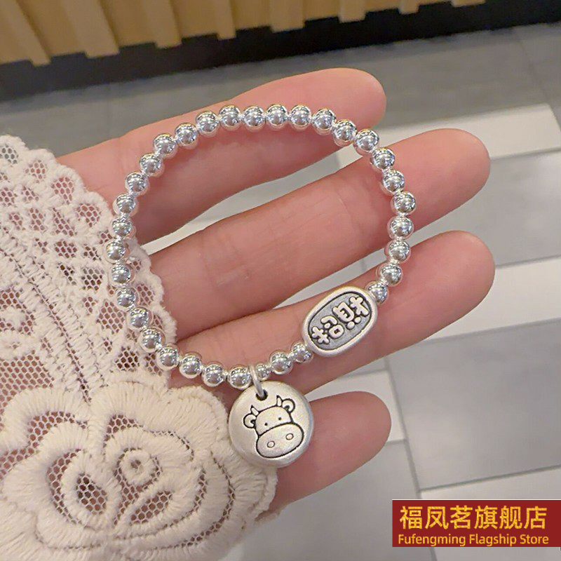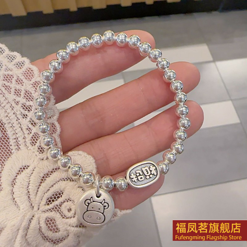 正生新款招财纳福牛纯银手链足银999女宝儿童大人珠银珠手串