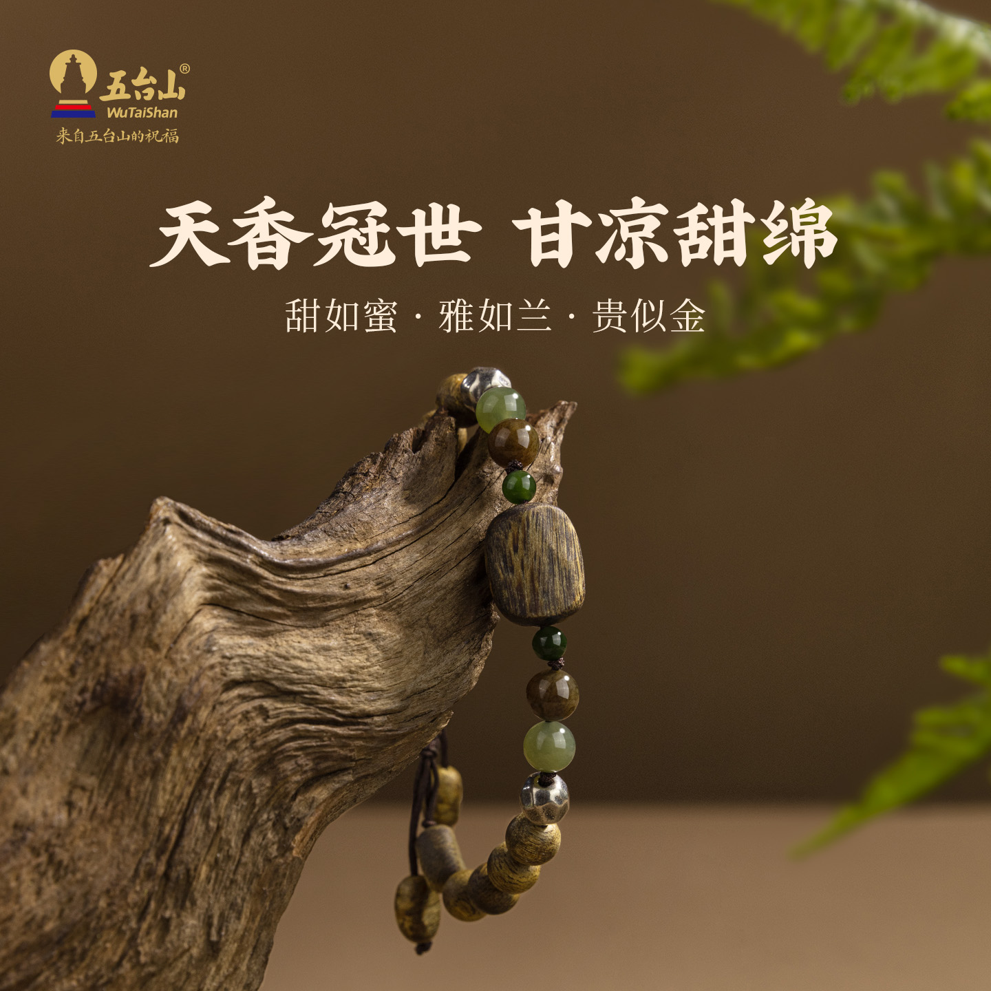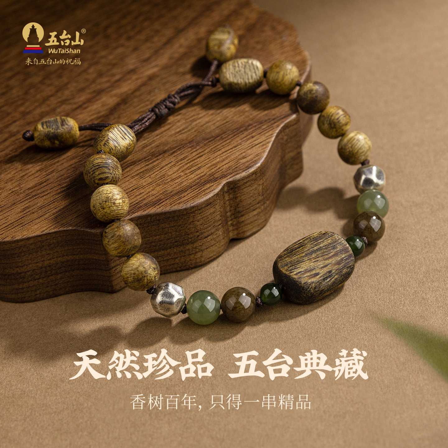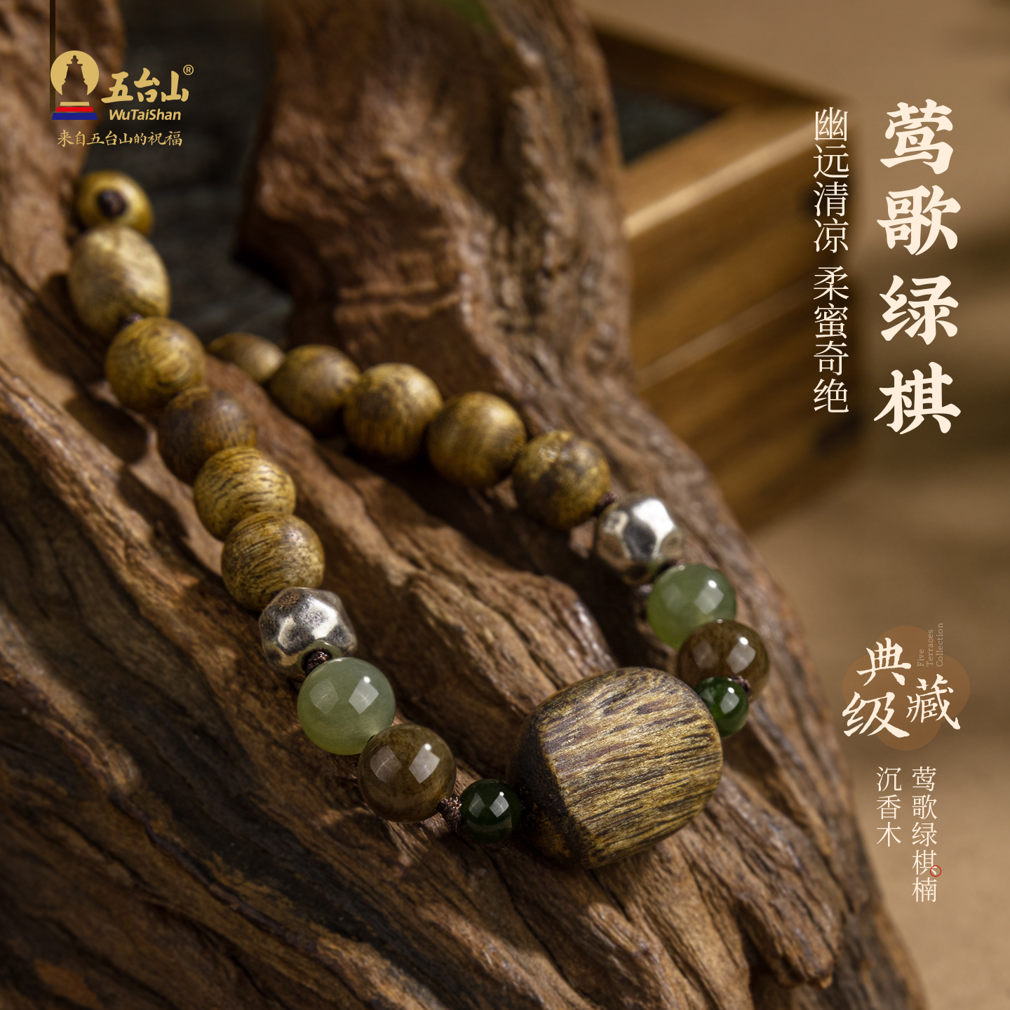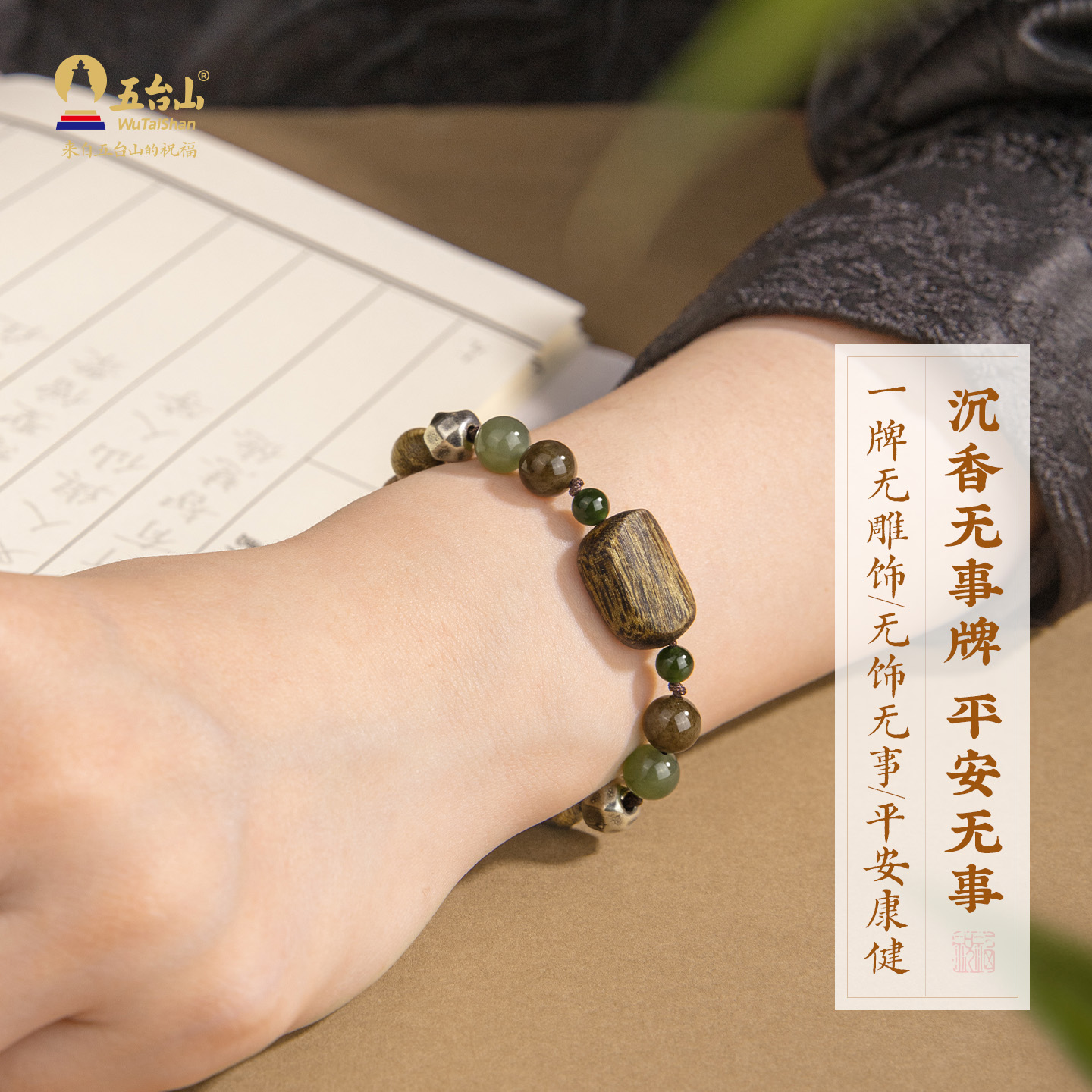 五台山莺歌绿奇楠沉香木手串无事牌平安925银和田玉文玩木质手链