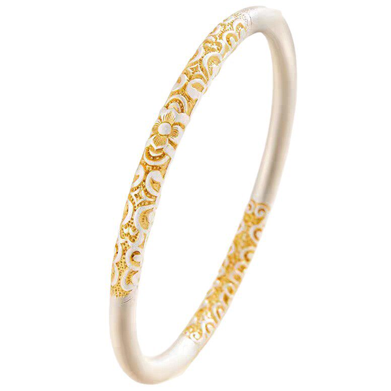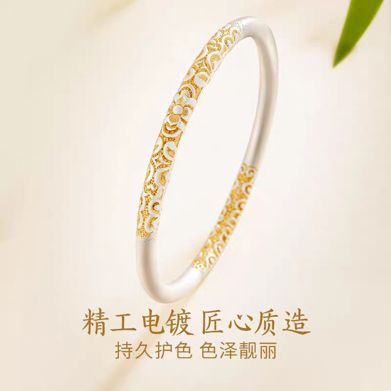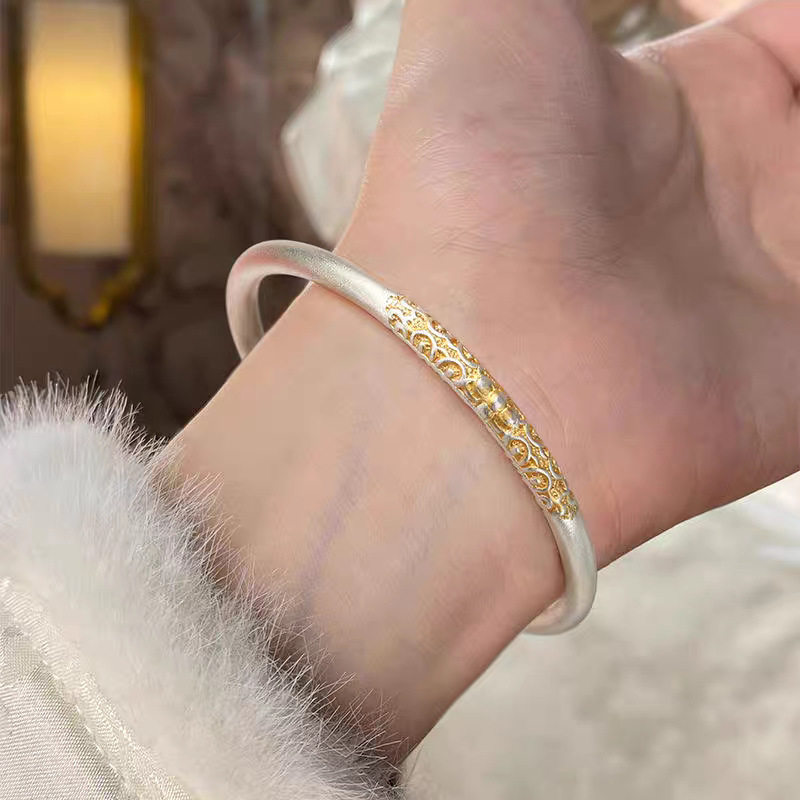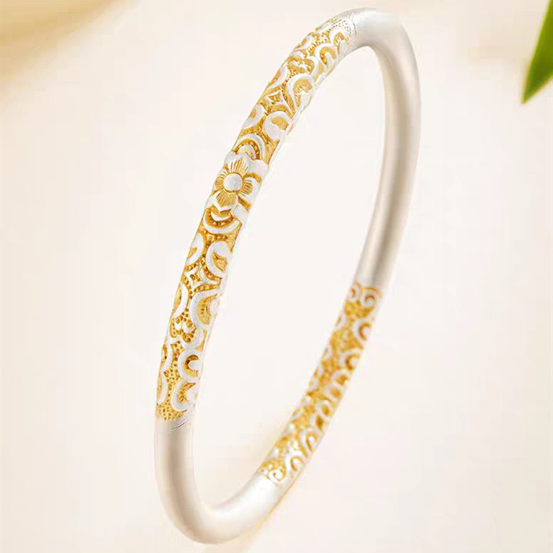 铜镀银手镯中式枝繁叶茂描金闭口卷唐草纹手镯女古风精致磨砂手镯