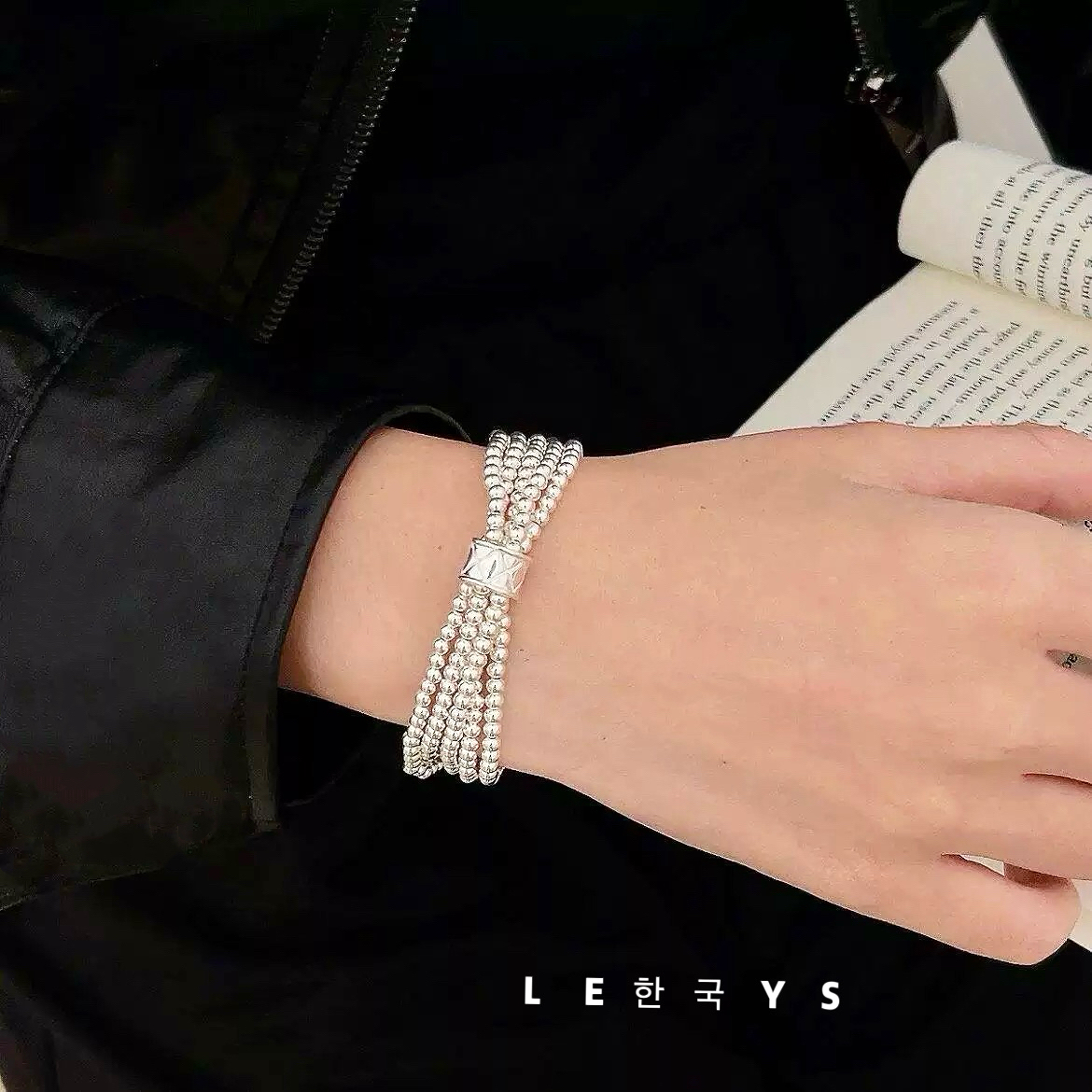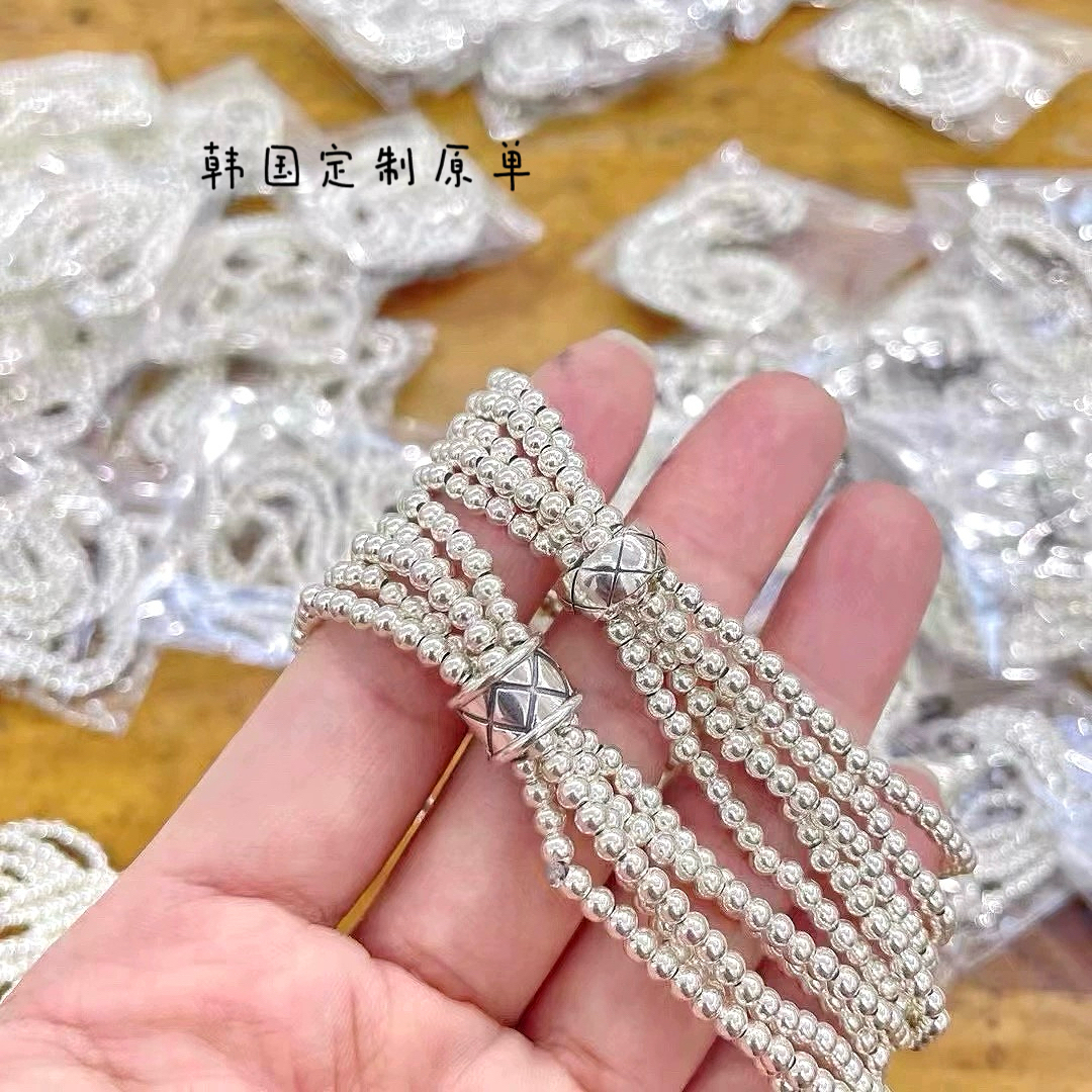 韩国原单s925纯银小香风菱格路路通多层圆珠手链重工个性叠戴百搭
