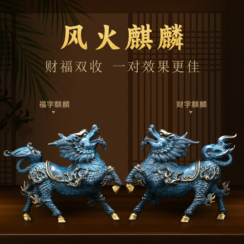 《风火麒麟》铜麒麟摆件一对纯黄铜公母招财客厅店铺开业装饰礼品