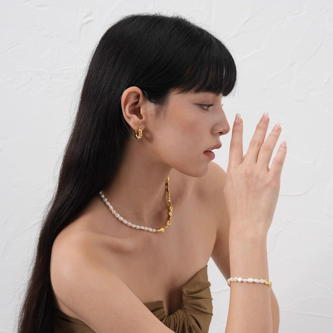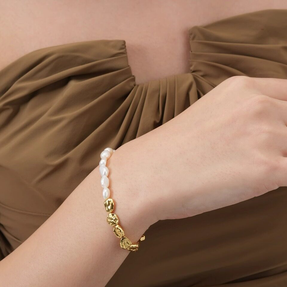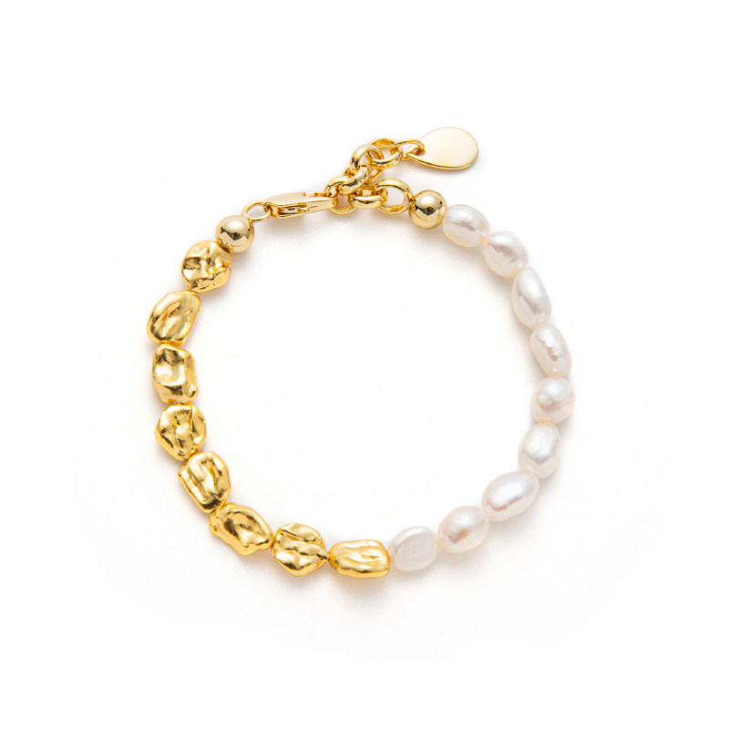 VOGUEWANG法式S925纯银金色天然不规则巴洛克珍珠金豆拼接手链镯
