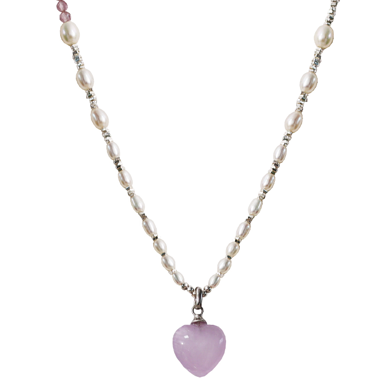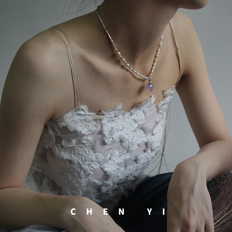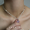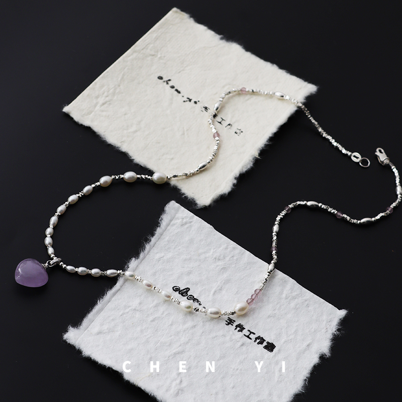 复古珍珠天然石925银项链 原创小众紫色禁欲系心形温柔锁骨颈链女