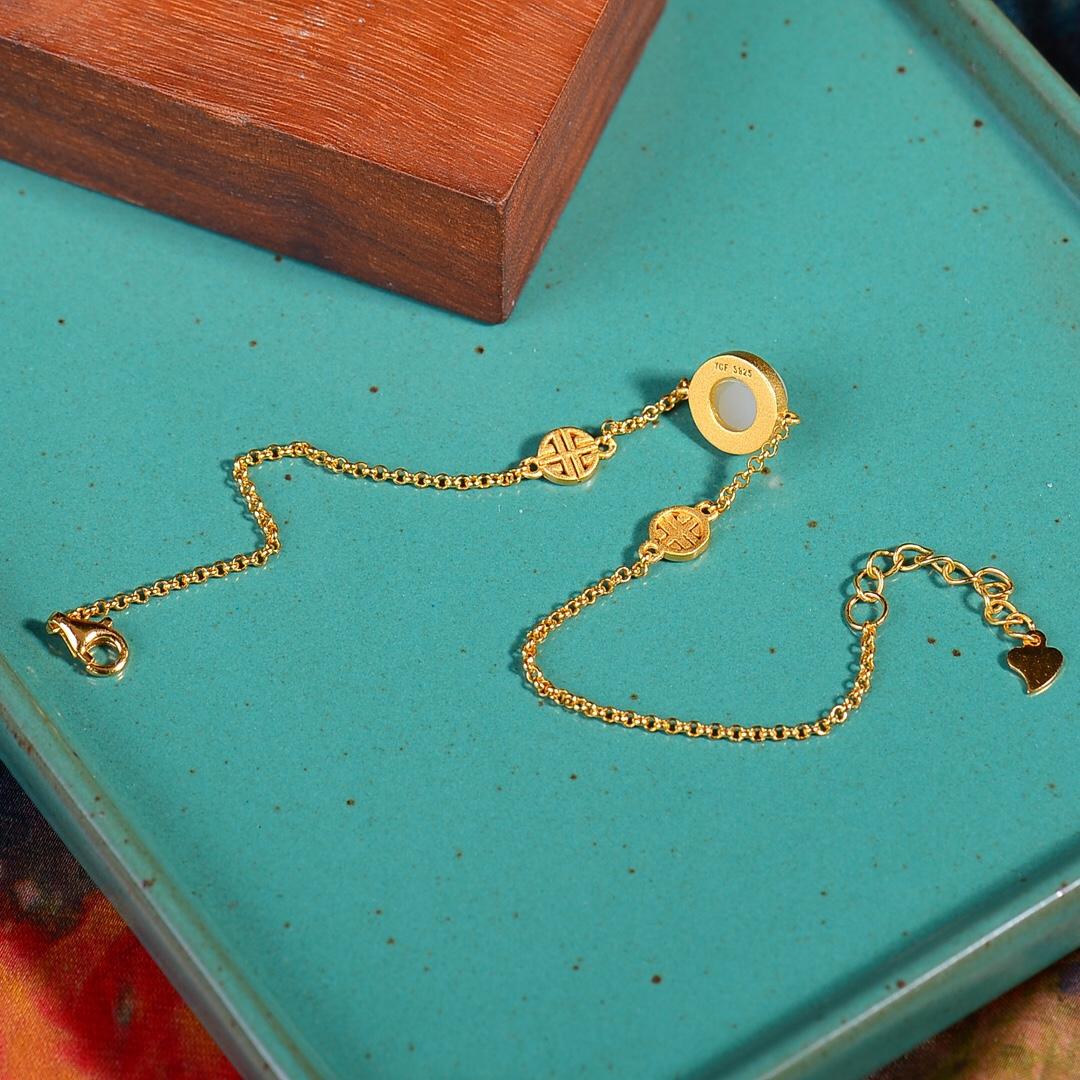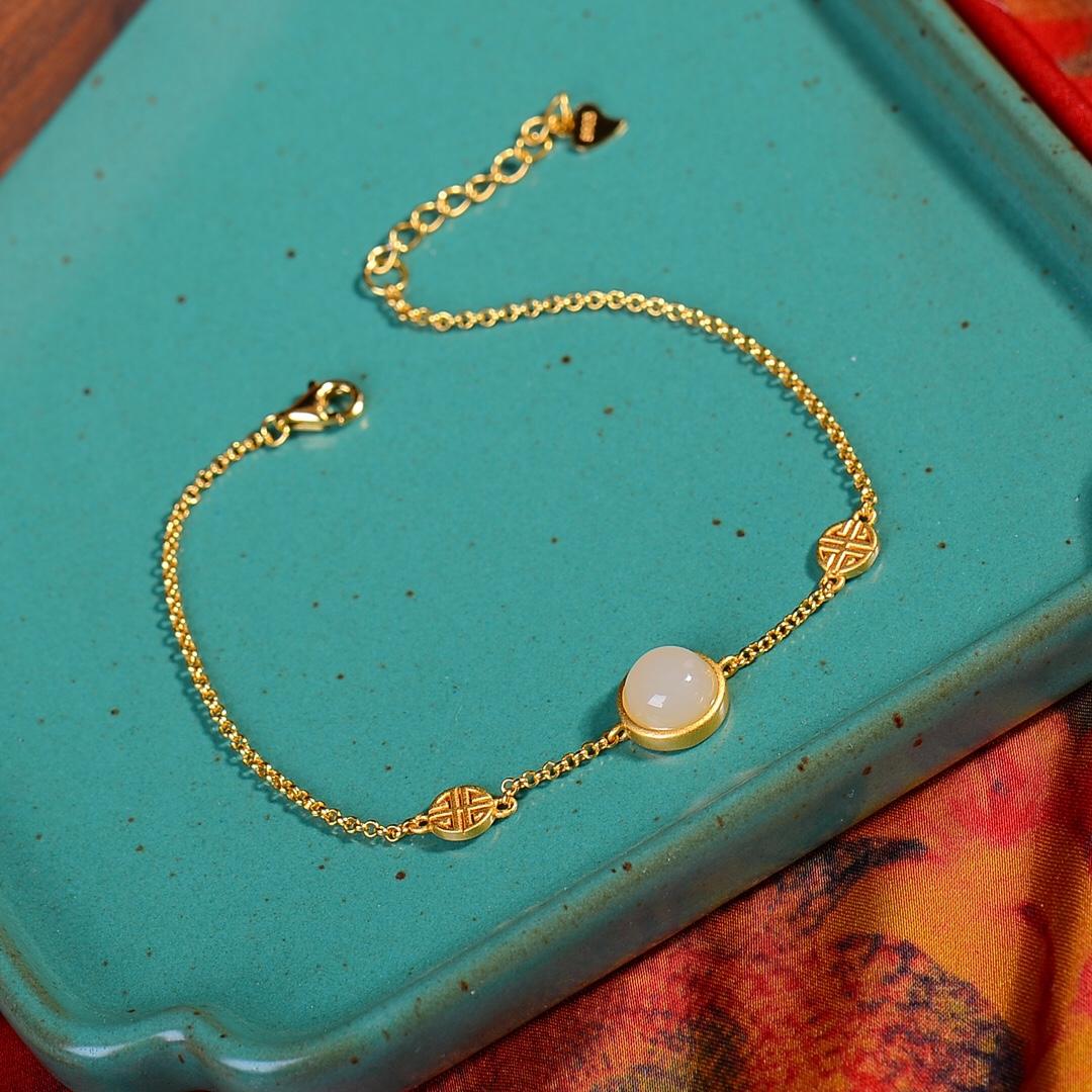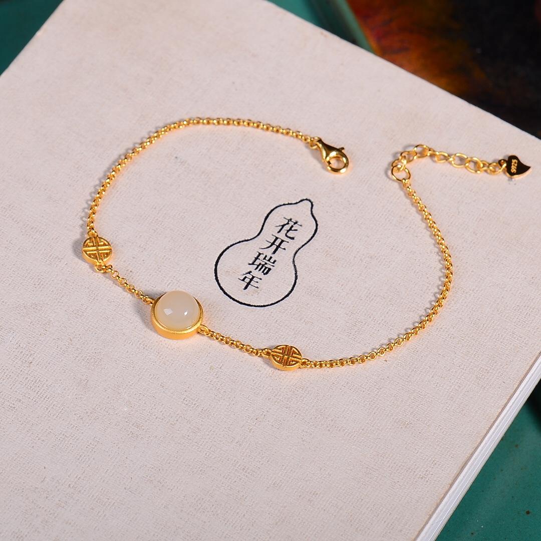S925银镶嵌和田玉圆蛋面手链证书加盒子新疆和田玉古法金工艺镶嵌