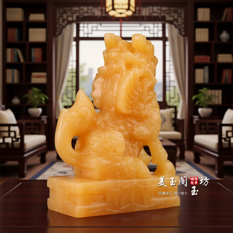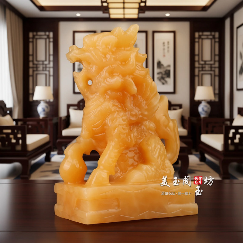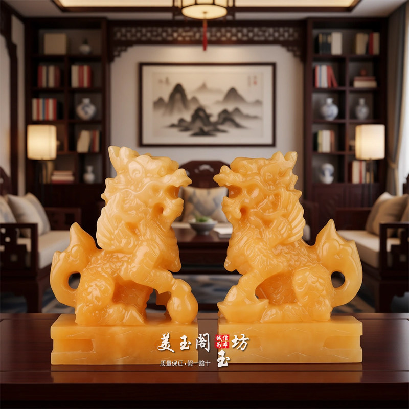黄玉麒麟摆件一对玉石招财镇宅麒麟客厅办公室玄关风水装饰品乔迁