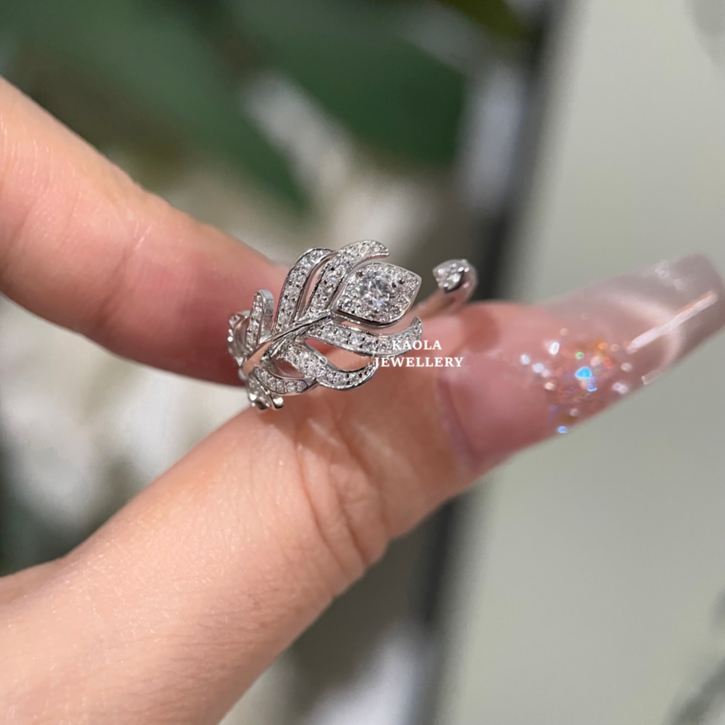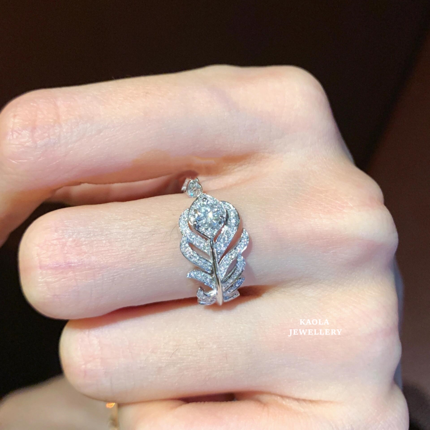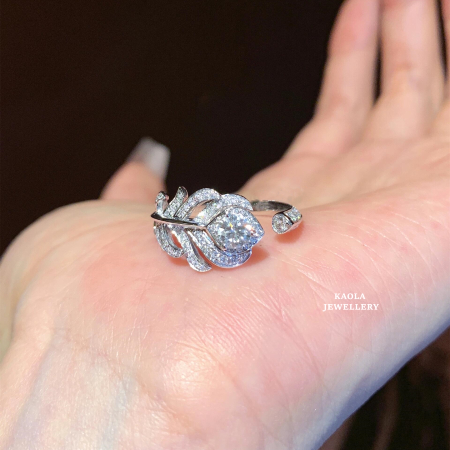 18K白金孔雀羽毛戒指 女轻奢纯银满钻叶子指环时尚高级感露珠礼物