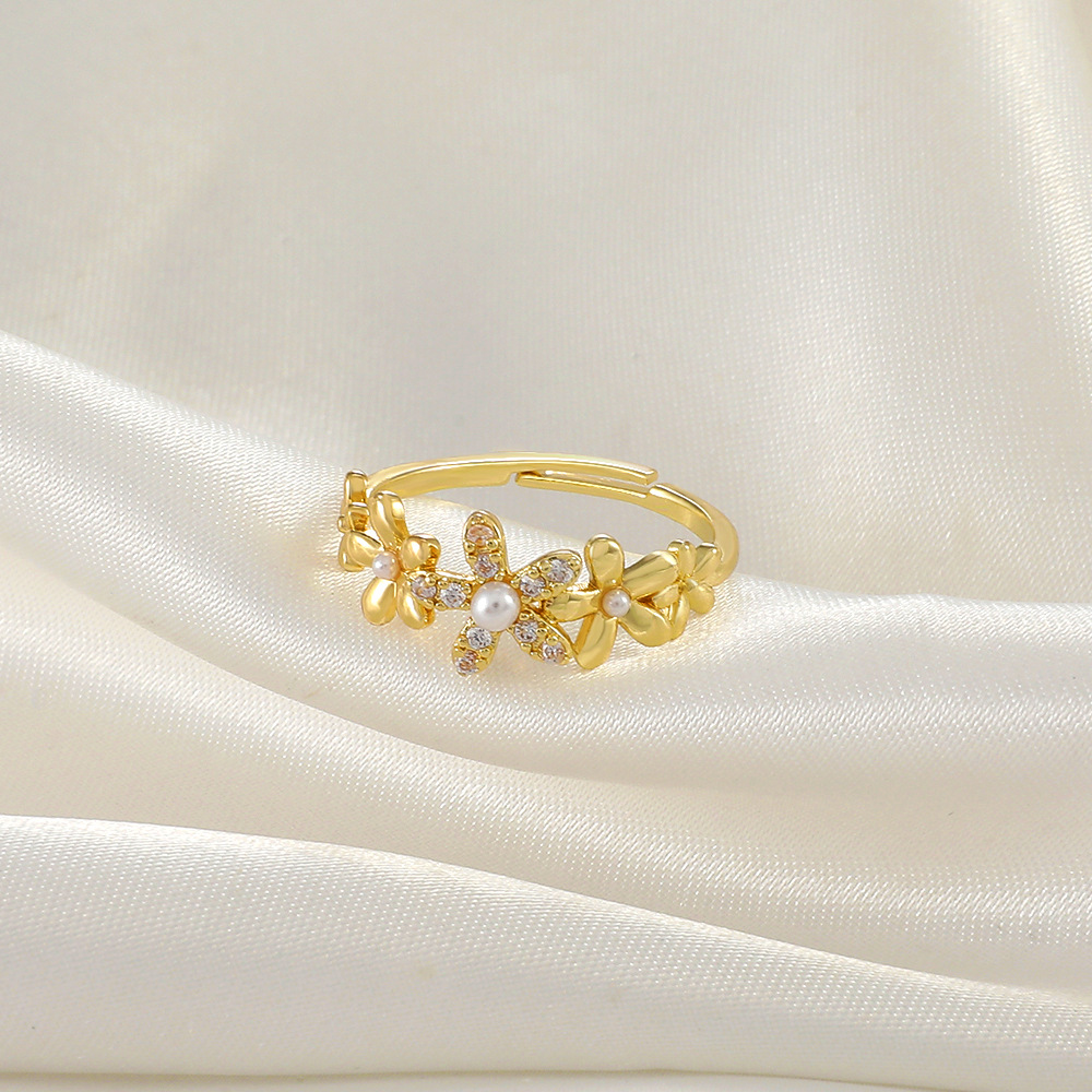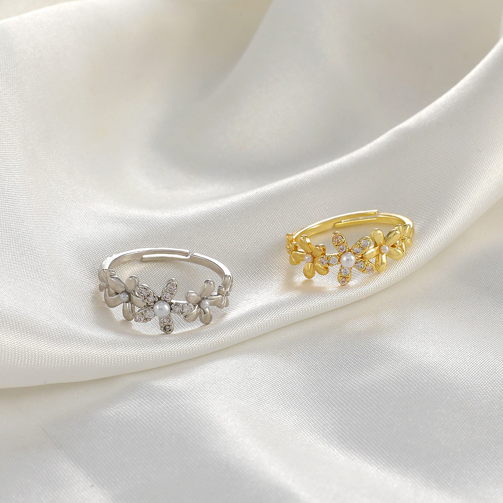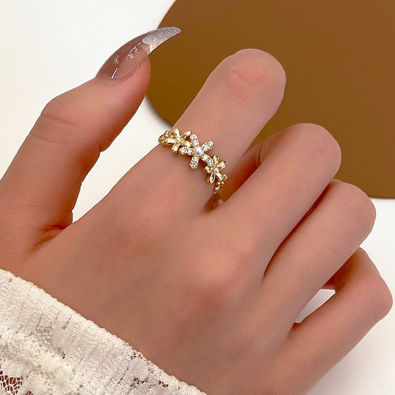 欧美ins珍珠花朵戒指女 时尚气质小众设计镶钻小花食指戒网红戒子