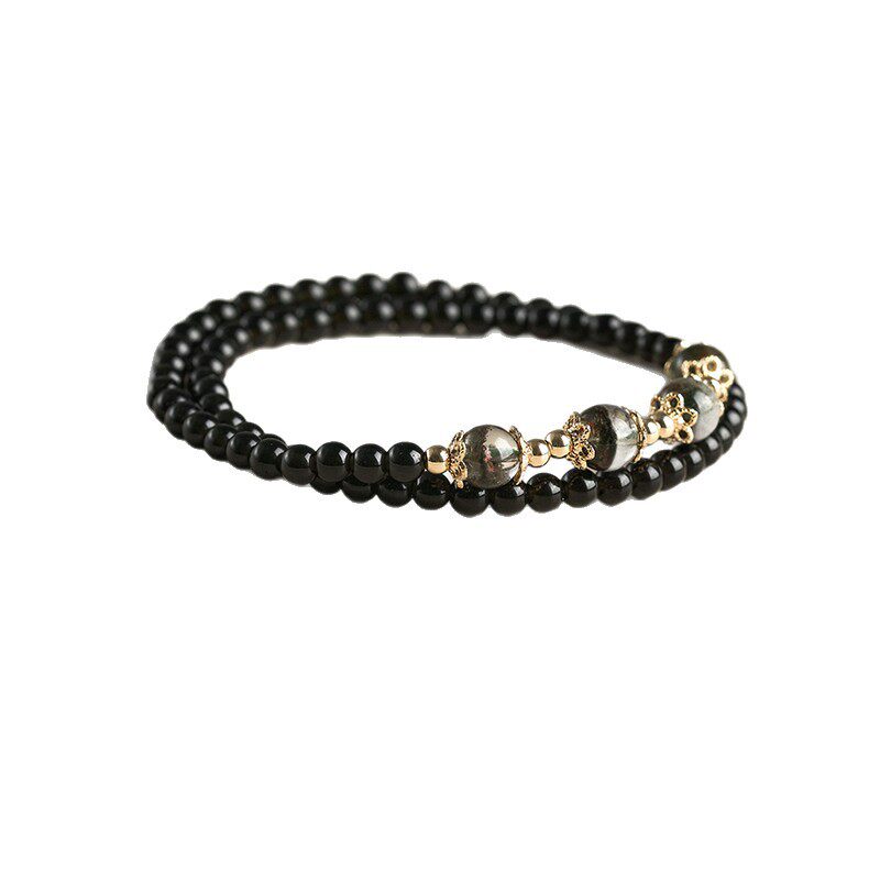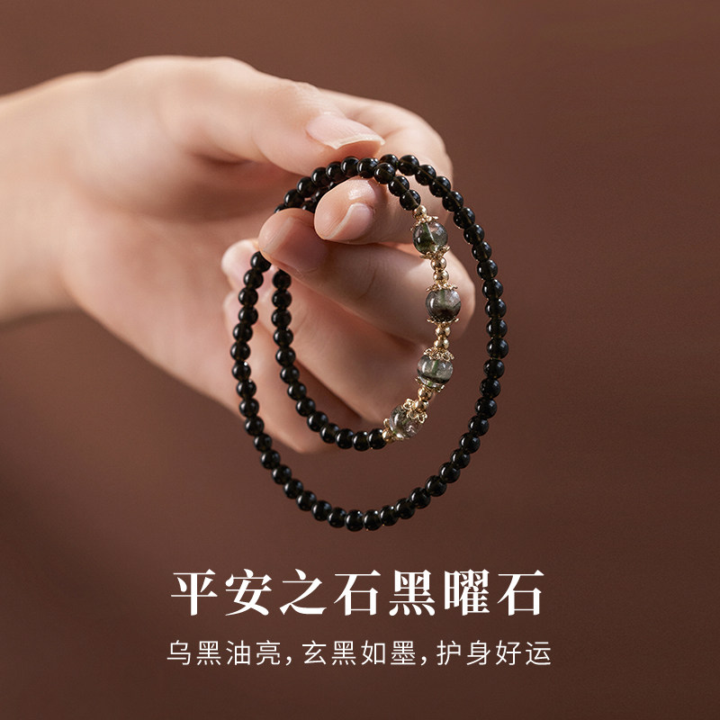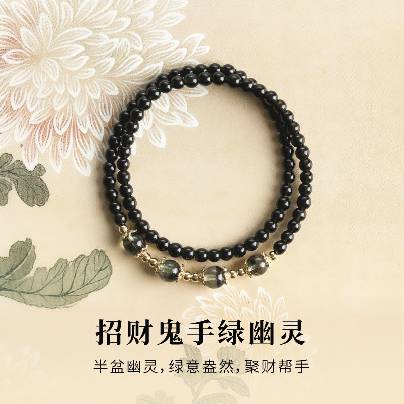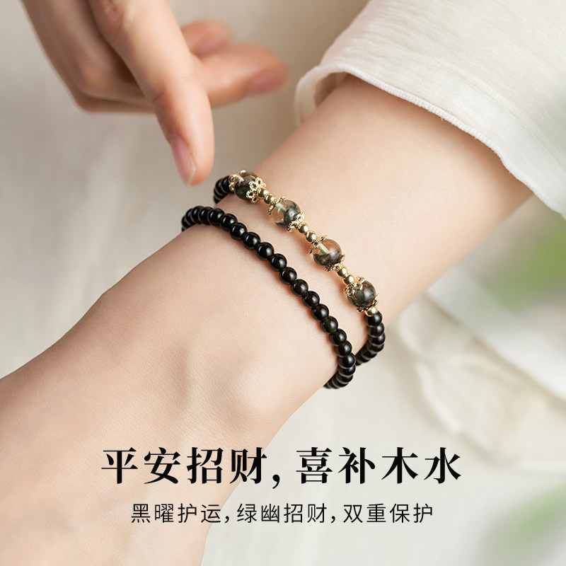 黑曜石手串女天然乌金黑色水晶绿幽灵双圈招财水木手链首饰