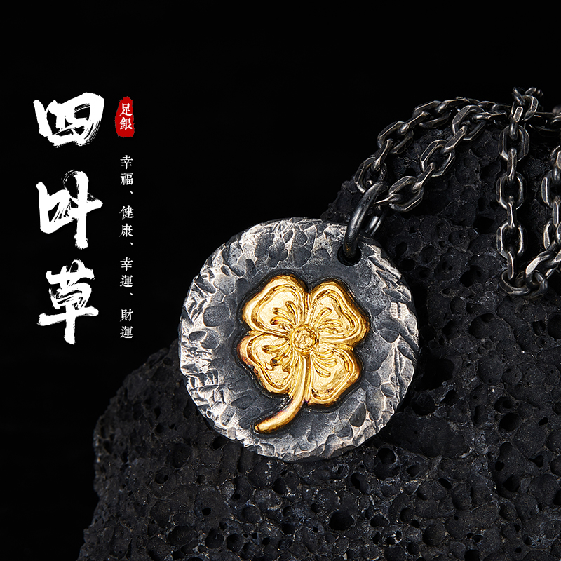 原创设计【四叶草】项链男女99纯银镶24K金吊坠手工定制圆牌挂坠