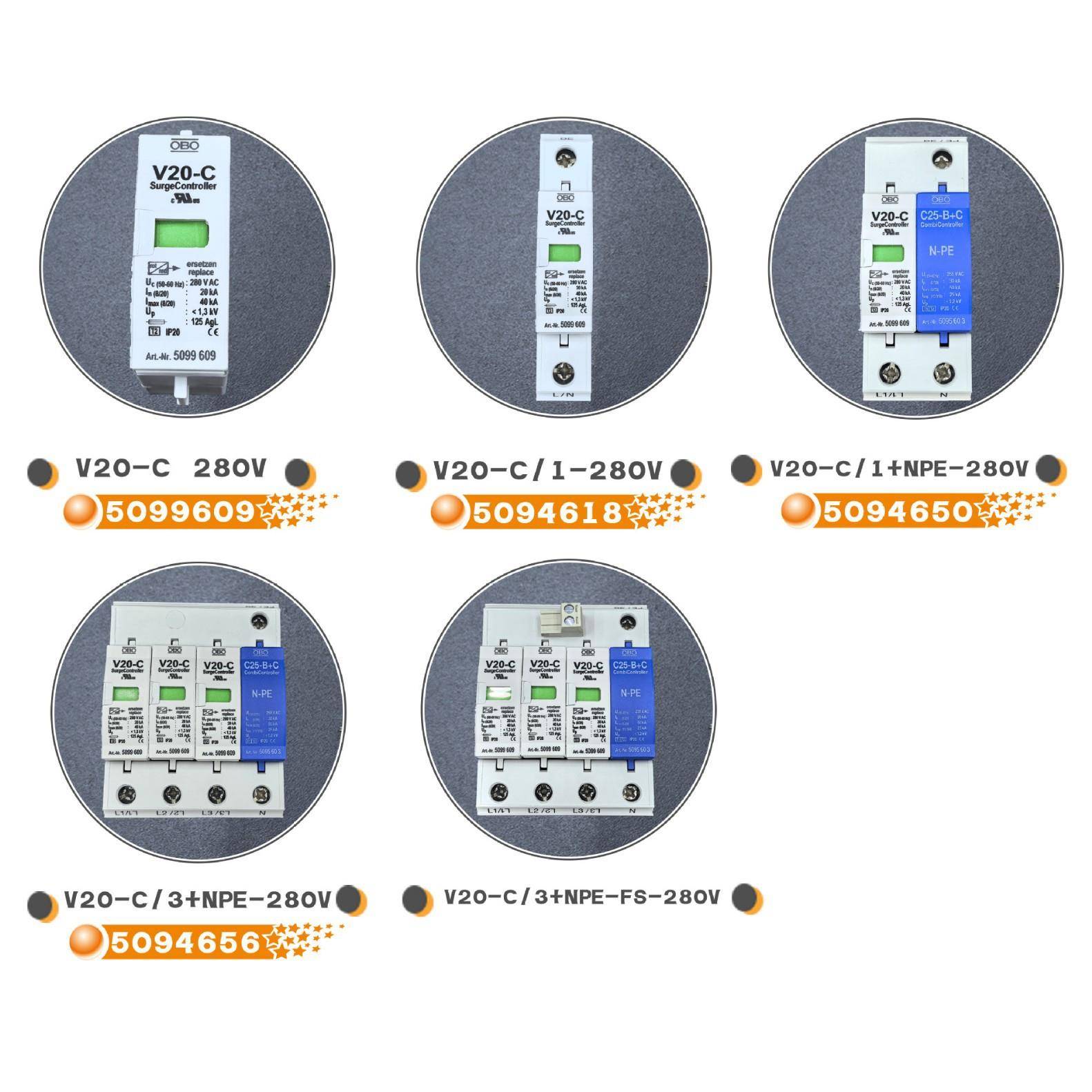OBO电涌防雷器V20-C/3+NPE-FS-280V原装避雷器电源2级浪涌保护器