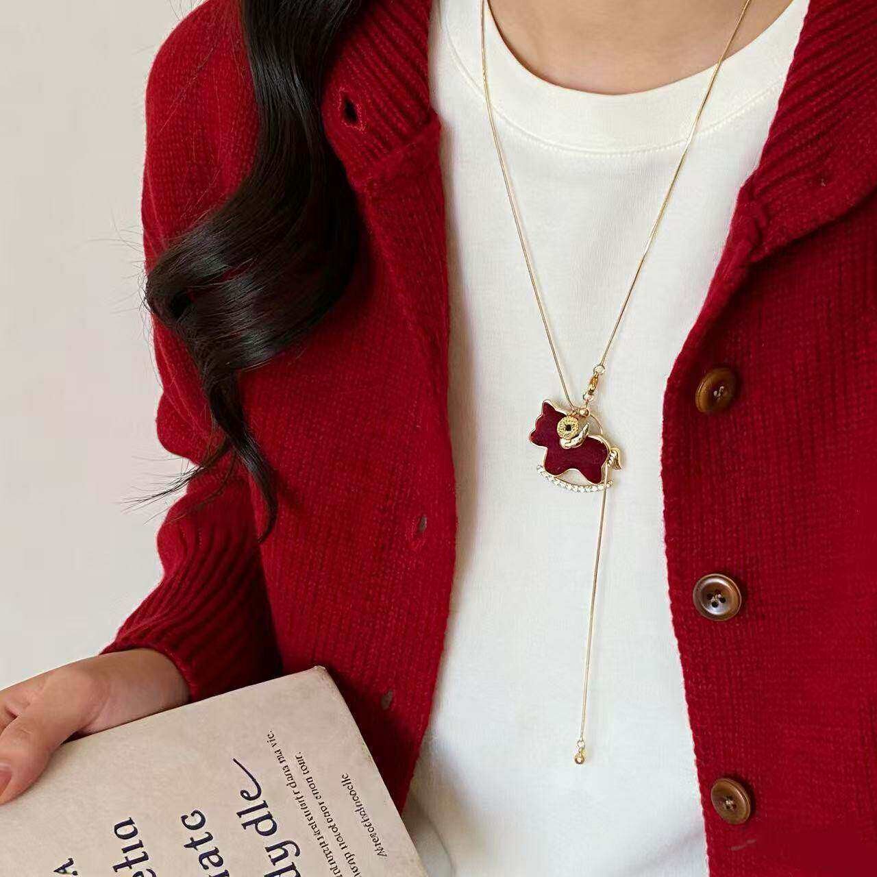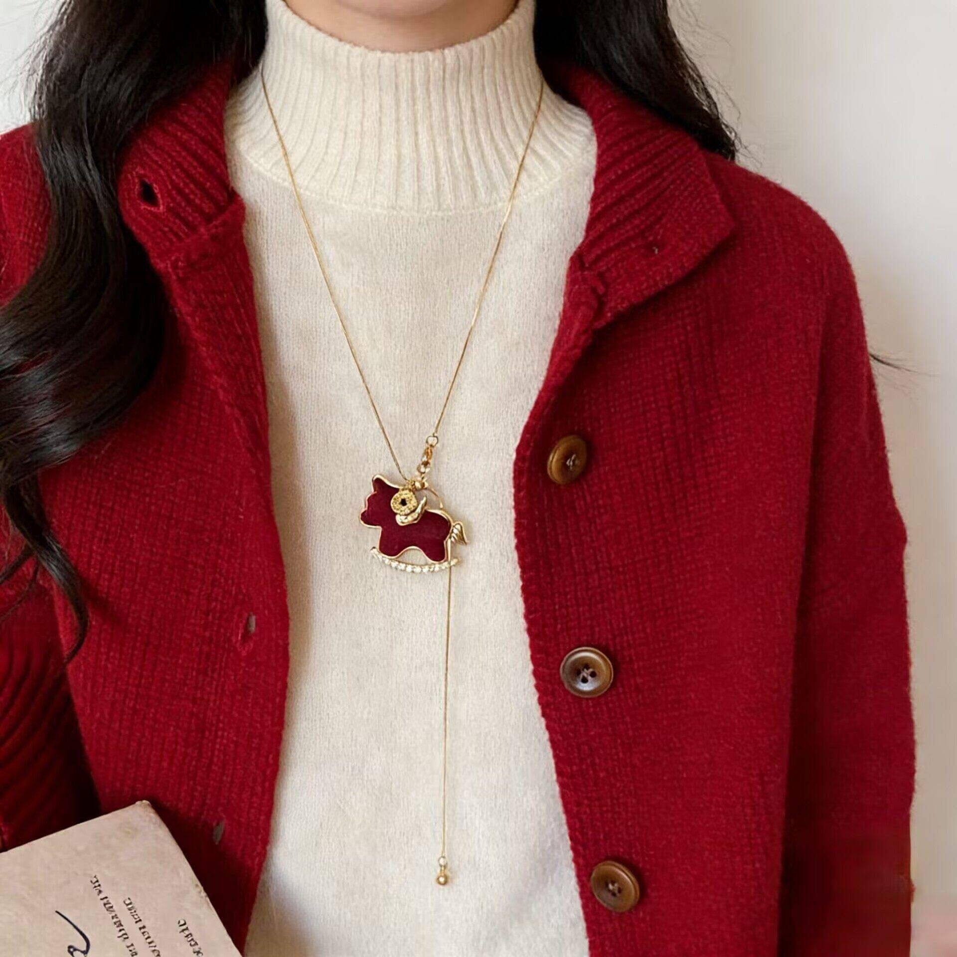 2026马年红色丝绒吊坠项链女秋冬本命年轻奢高级感新年毛衣链配饰