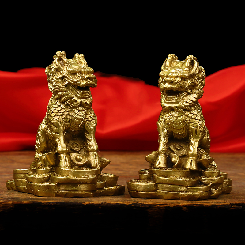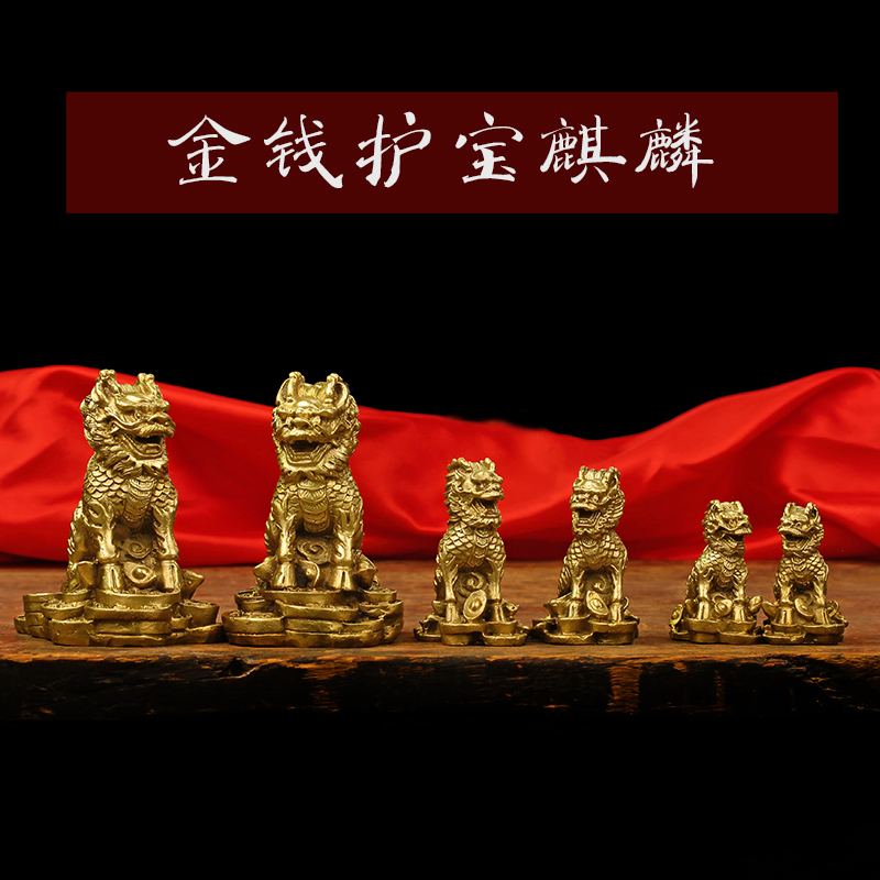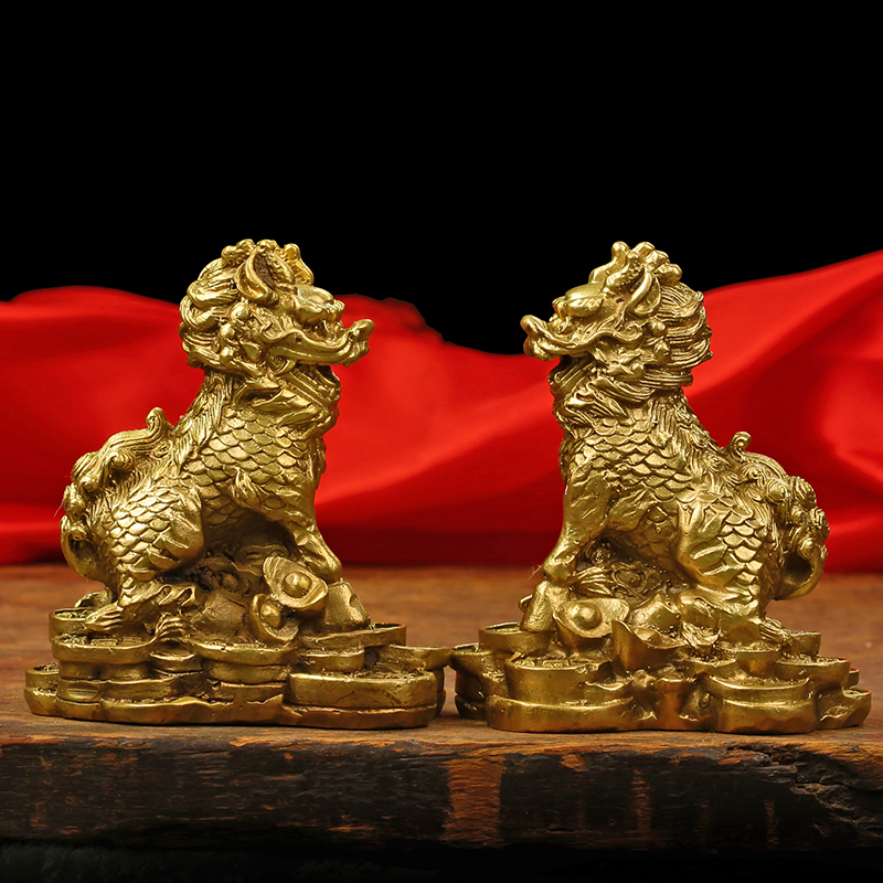 纯黄铜护宝财富麒麟摆件一对 振宅招财家居办公铜麒麟装饰品