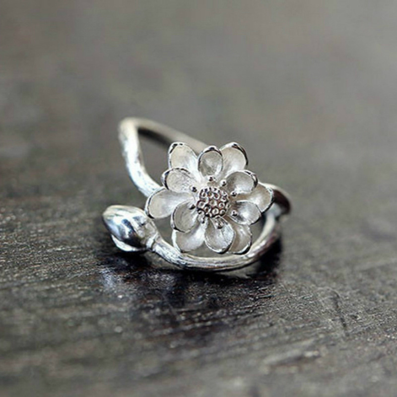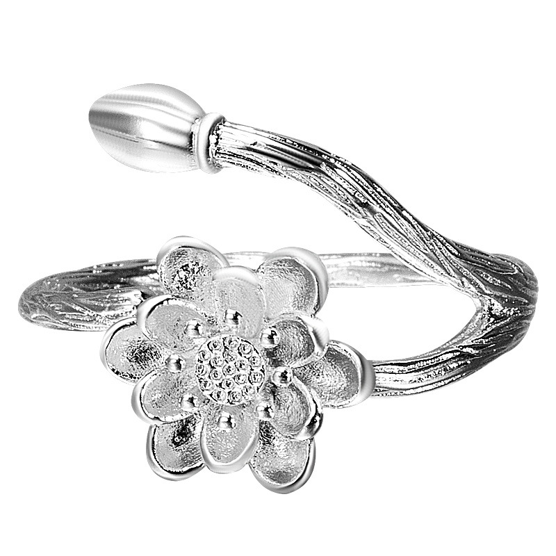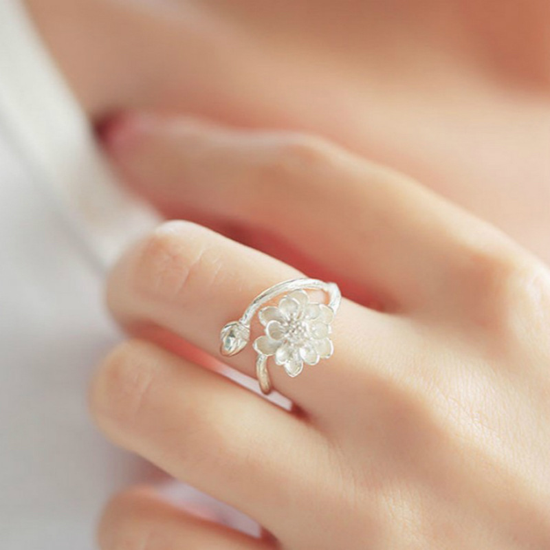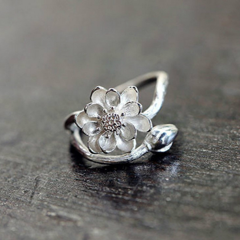 原创设计S925纯银饰品唯美简约中国风荷花手工开口戒指女指环百搭