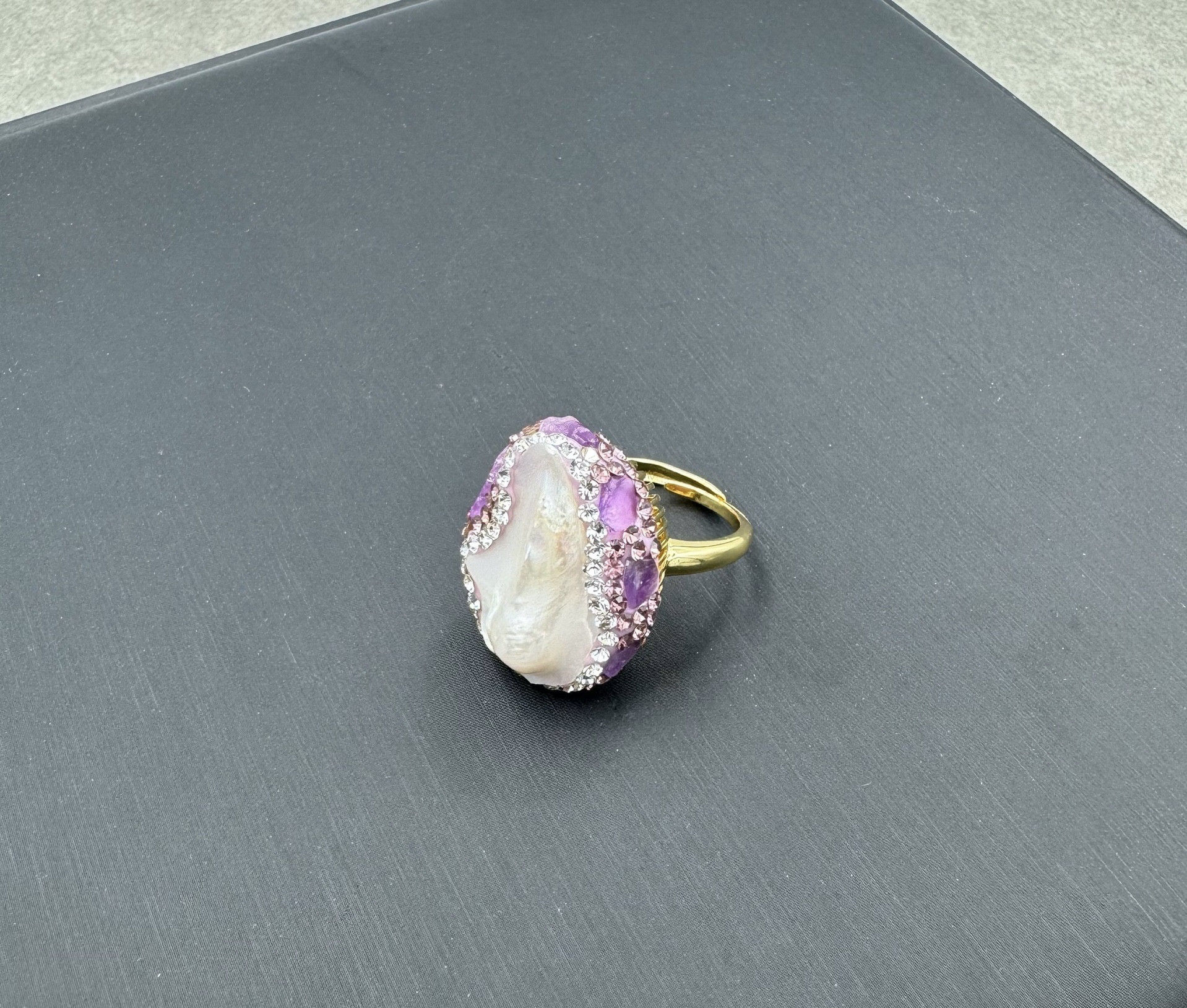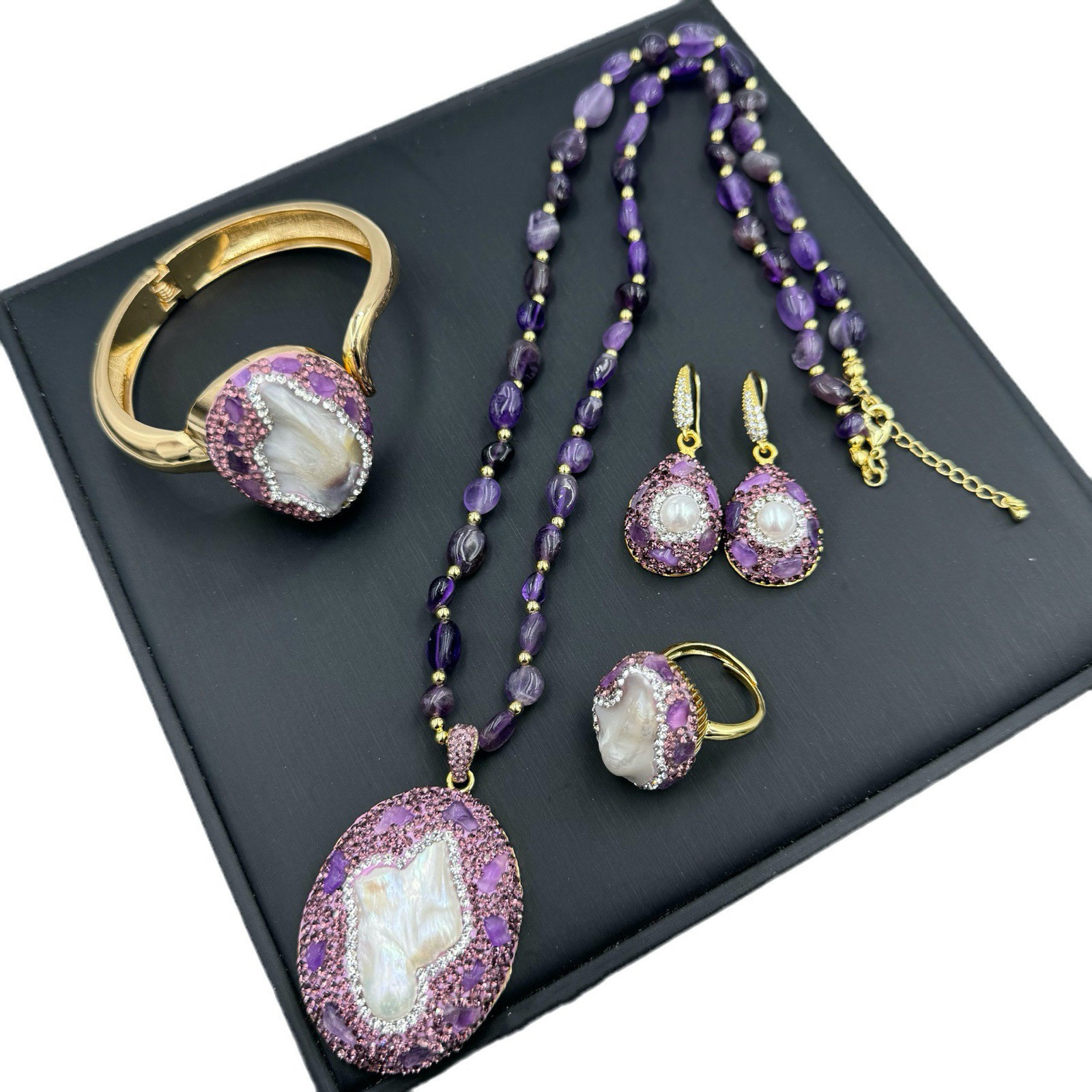 新款紫色巴洛克淡水珍珠套装精美高档小众中古项链耳饰戒指
