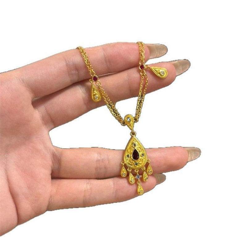 新款中国风水滴项链泪珠设计复古黄色精致流苏小众高级吊坠