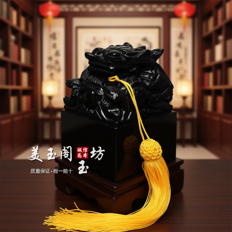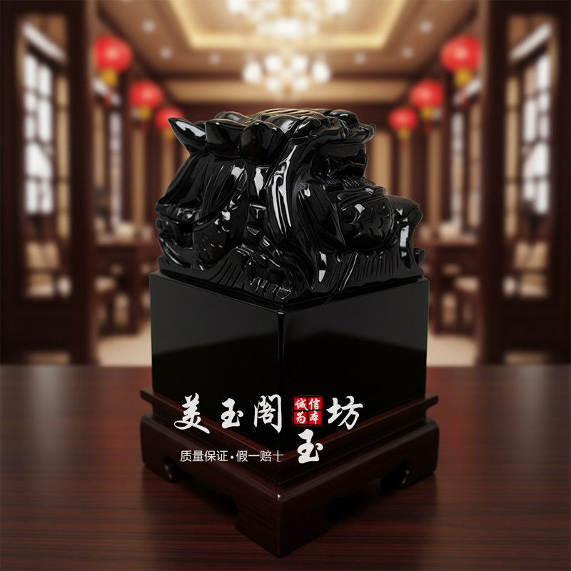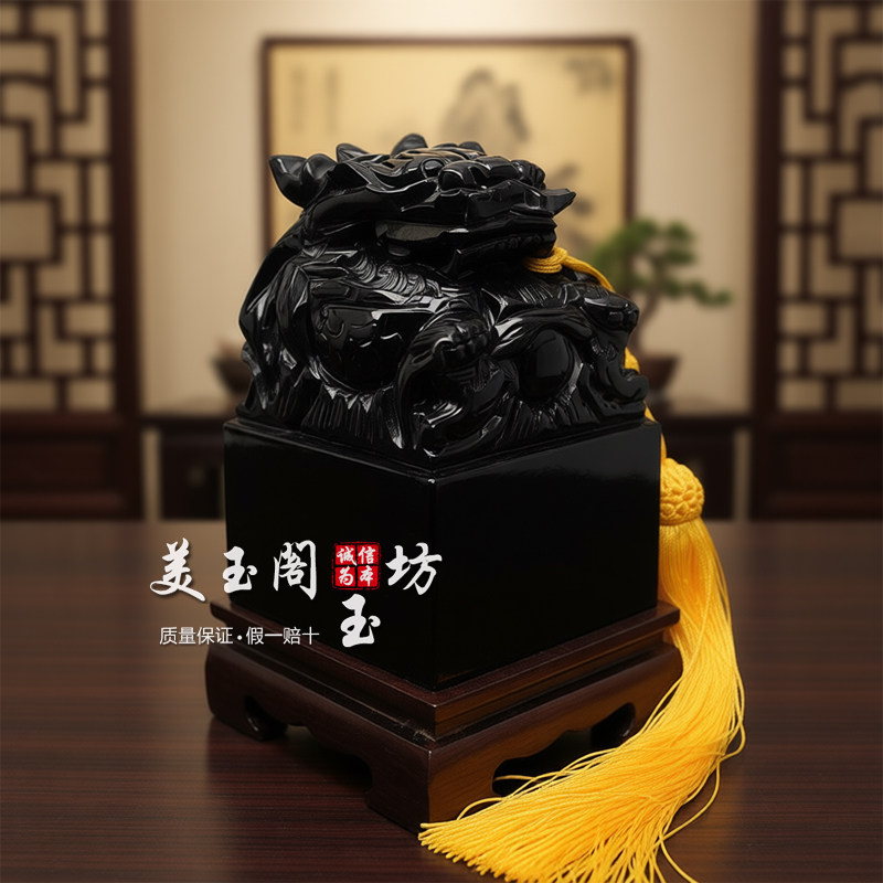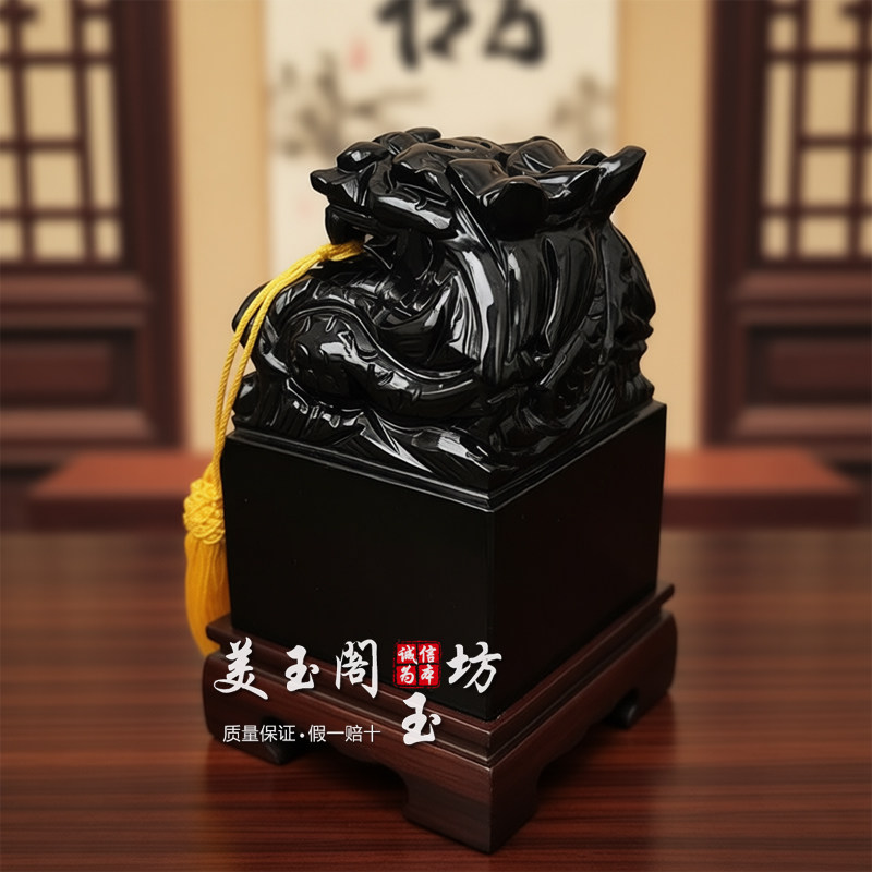 天然黑曜石龙头玉玺篆刻印章摆件招财镇宅办公室桌面玄关乔迁礼品