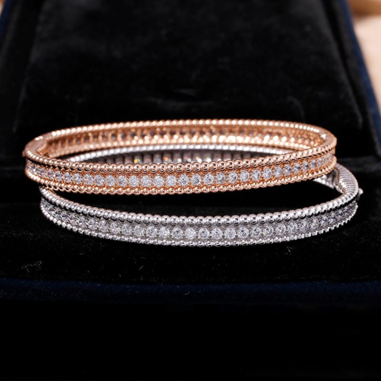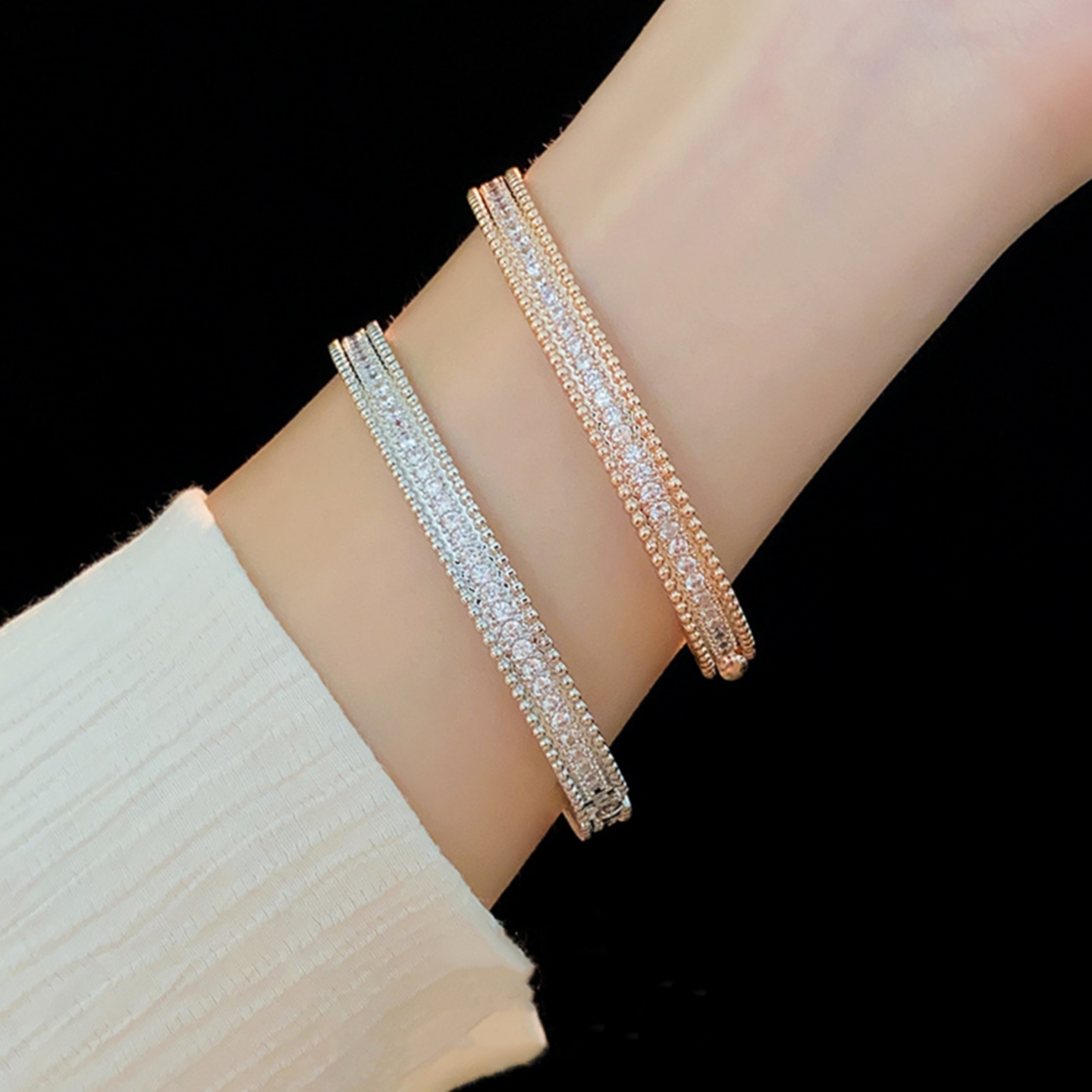 潮港福18K白金珠边排钻手镯 女纯银满钻手环手饰玫瑰金轻奢高级感