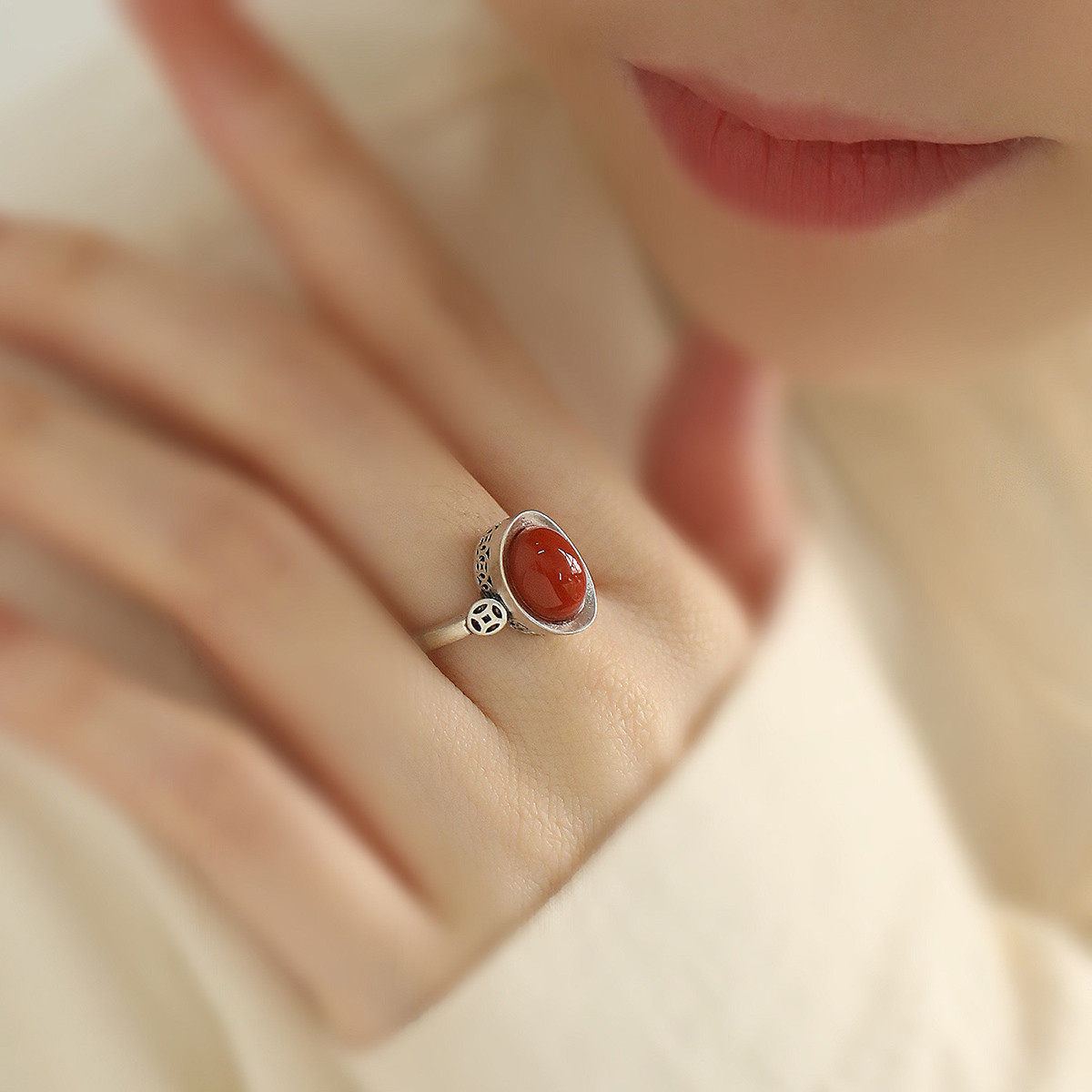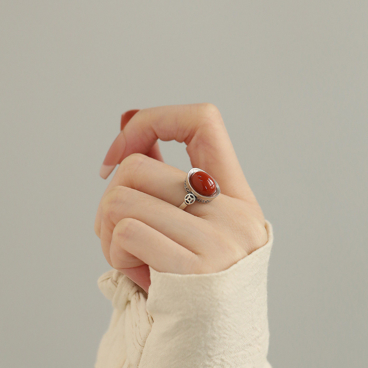 925纯银元宝南红玛瑙戒指女2026年高级感指环国风复古新中式饰品