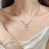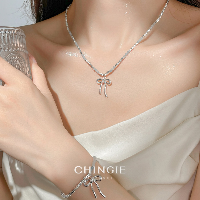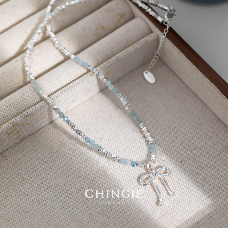 蓝色水晶串珠叠戴项链高级感轻奢小众碎银子蝴蝶结吊坠时尚锁骨链