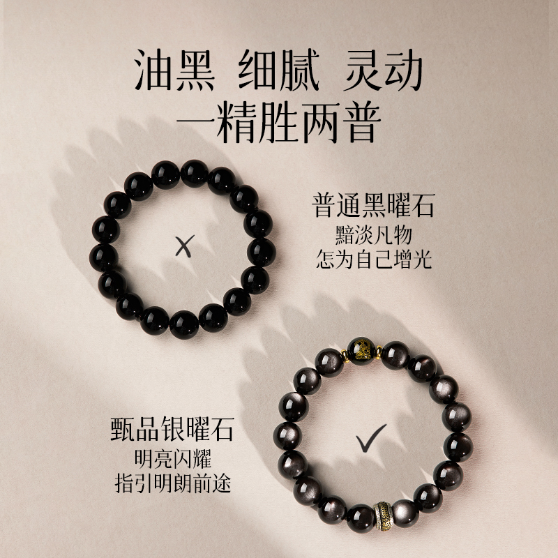 庆祥泰纯天然黑曜石手串官方旗舰店男士本命佛马年水晶银曜石手链