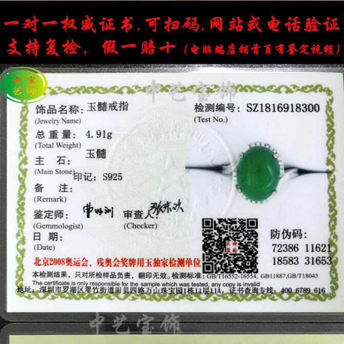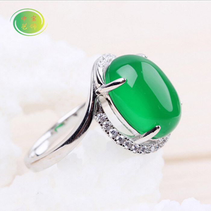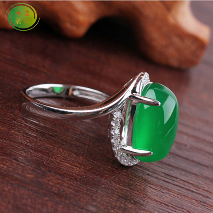纯银镀白金镶钻翡翠色天然玉髓宝石食指中指无名指可调节戒指带证