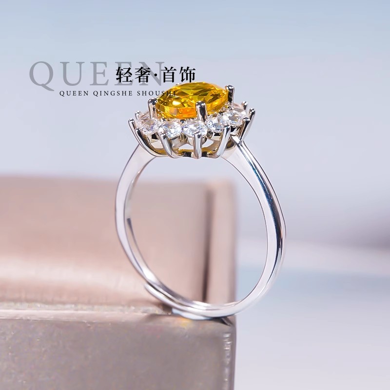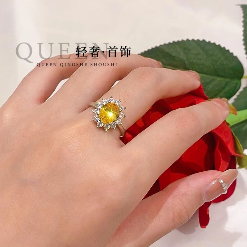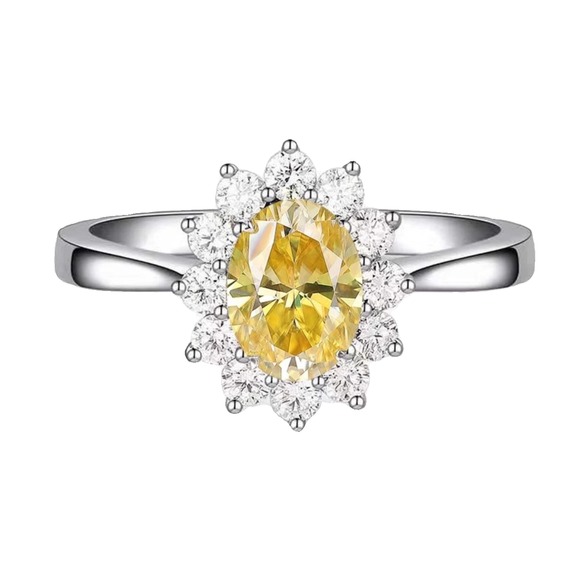 18K白金美国进口D色莫桑石太阳花黄钻戒指简约超闪群镶求婚钻戒
