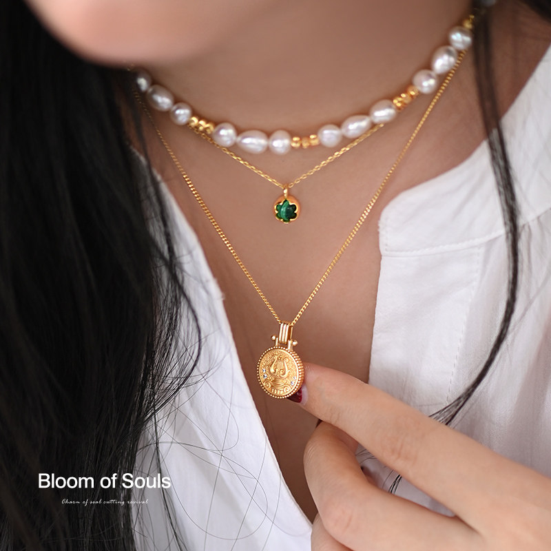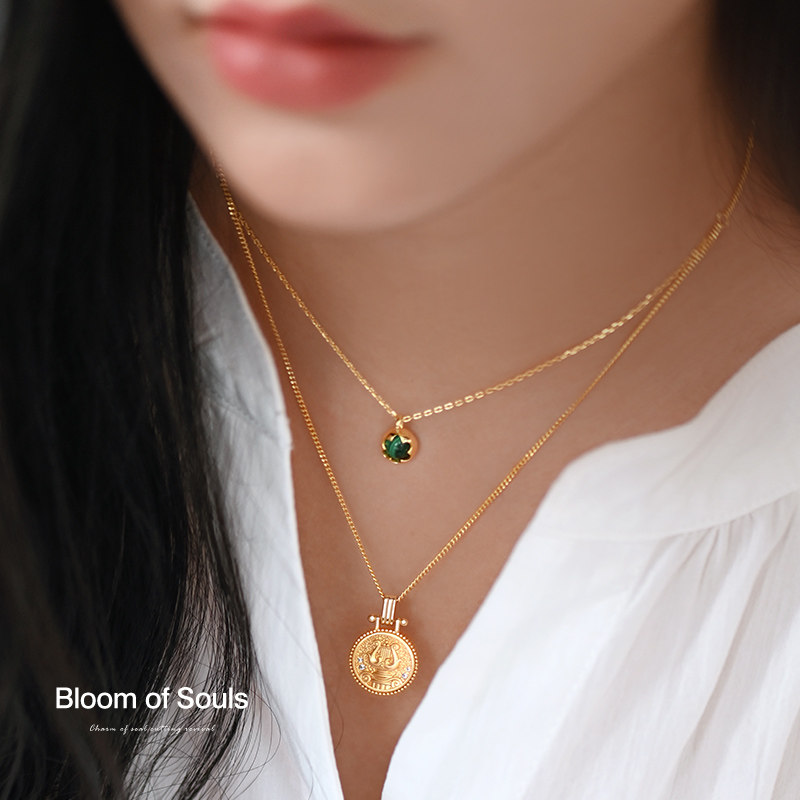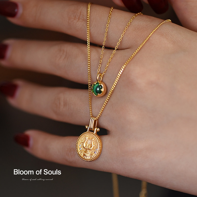 《一枚幸运币》原创设计S925纯银项链天然孔雀石竖琴金币法式复古
