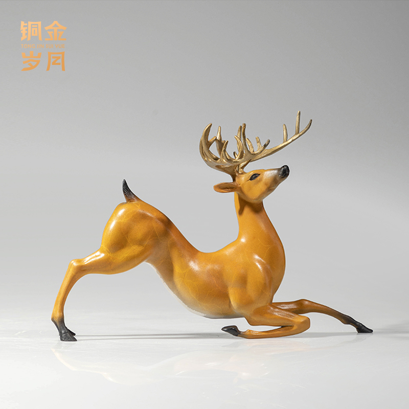 《瑞鹿呈祥》全黄铜鹿摆件一对工艺品新中式客厅玄关博古架装饰品