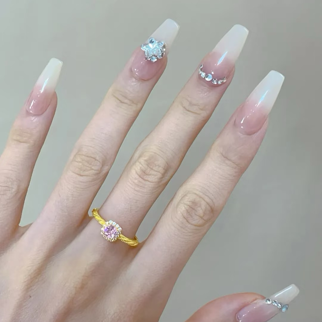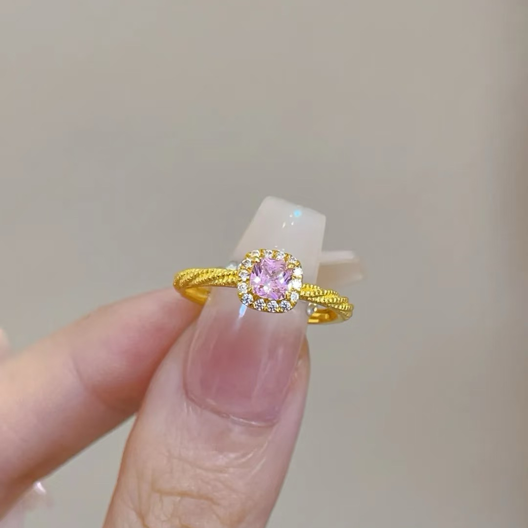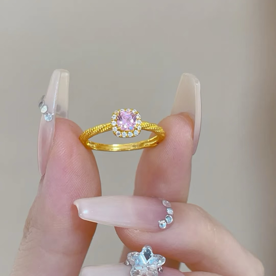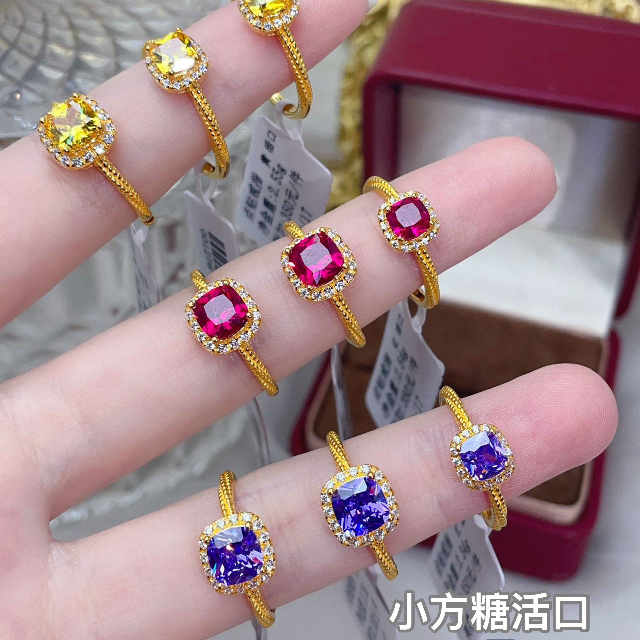 水贝黄金999小方糖戒指足金镶嵌莫桑钻首饰公主方钻戒送礼小克重