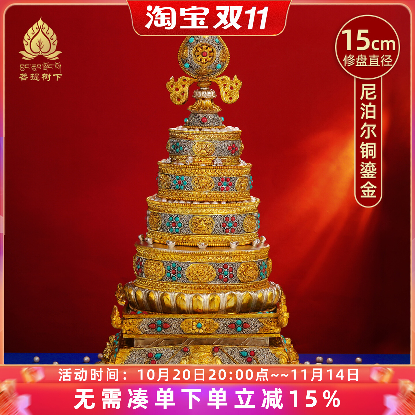 尼泊尔手工曼扎盘掐丝铜鎏银鎏金曼茶盘全套带底座曼茶罗大号15cm