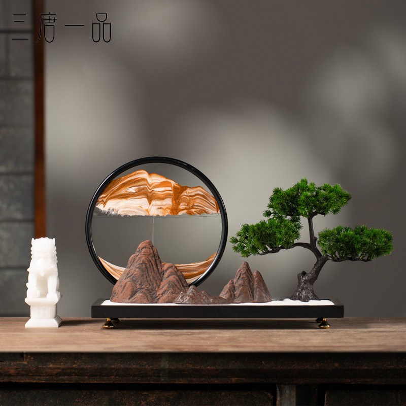 迎客松水墨江山流沙画摆件新中式入户玄关茶室禅意办公桌装饰品