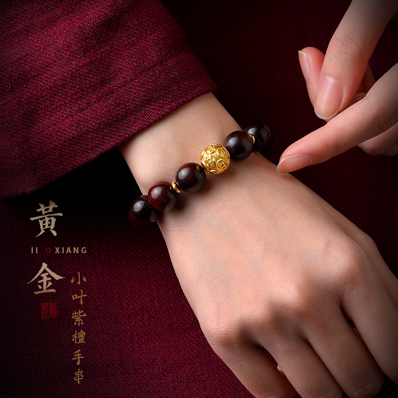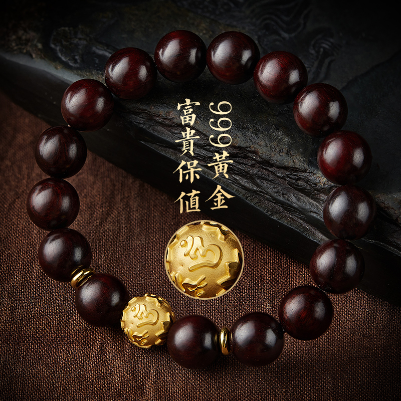 小叶紫檀手串男黄金转运珠足金文玩佛珠盘玩檀木质念珠手链真品