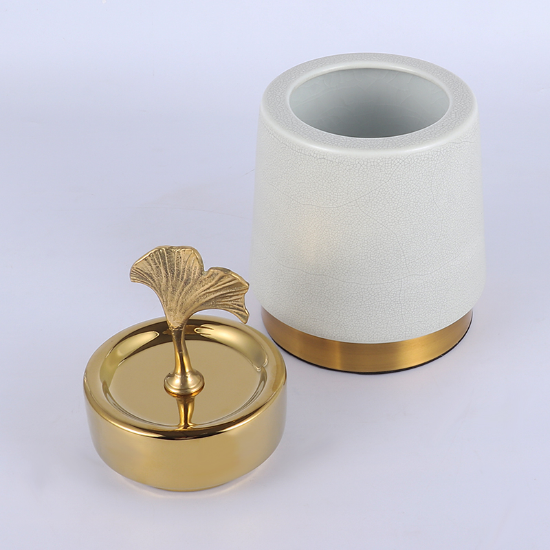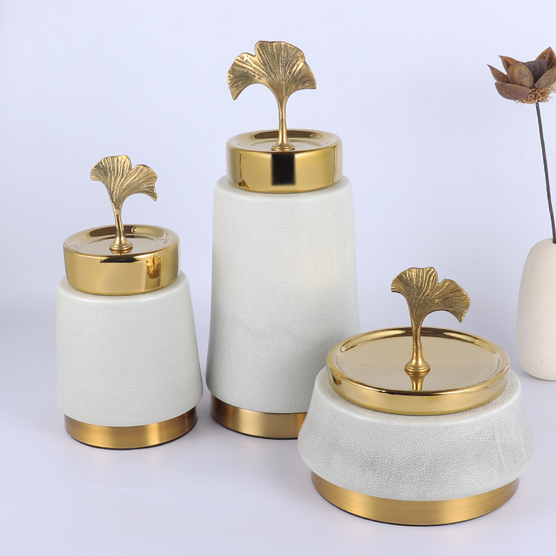 新中式陶瓷罐金色银杏花瓶盖花插储物罐美式玄关置物架装饰品摆件