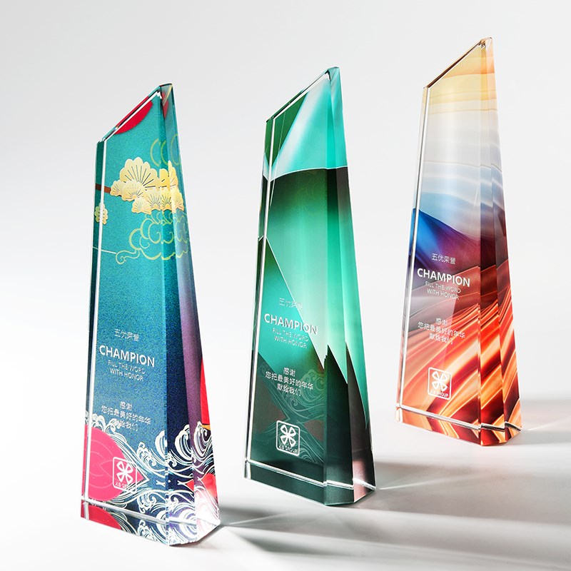 彩色水晶奖杯奖牌定制彩印蓝色绿色奖杯创意新款刻字制作销售年会