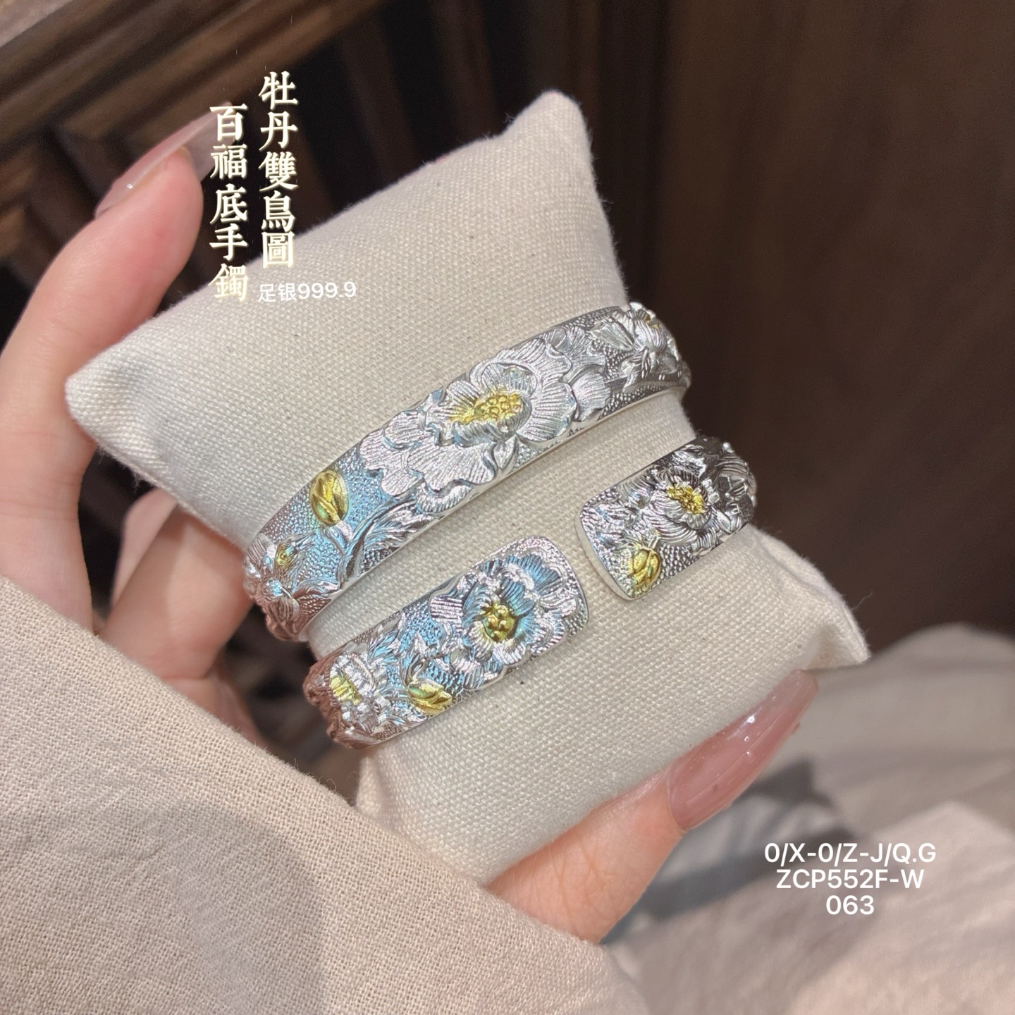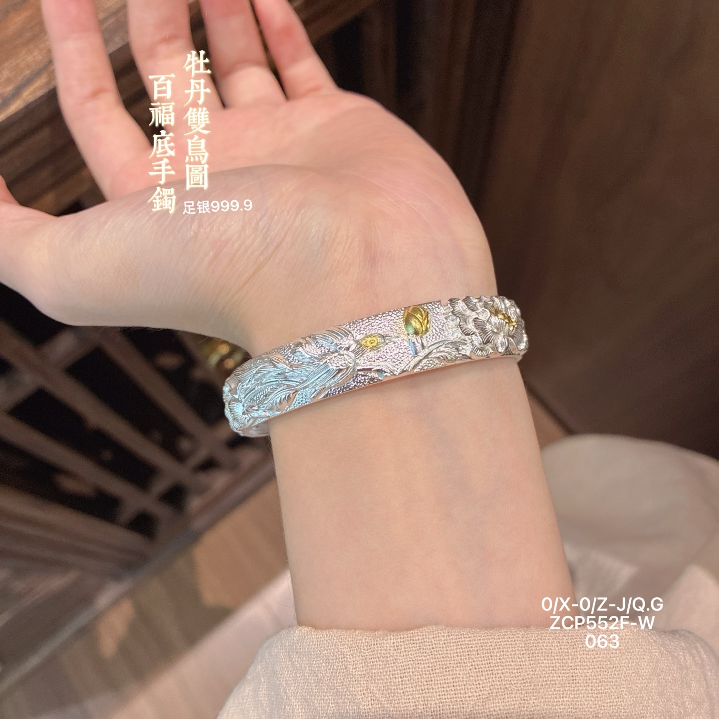 足银999.9古法分色牡丹双鸟图开口手镯女纯银新中式高级感百搭