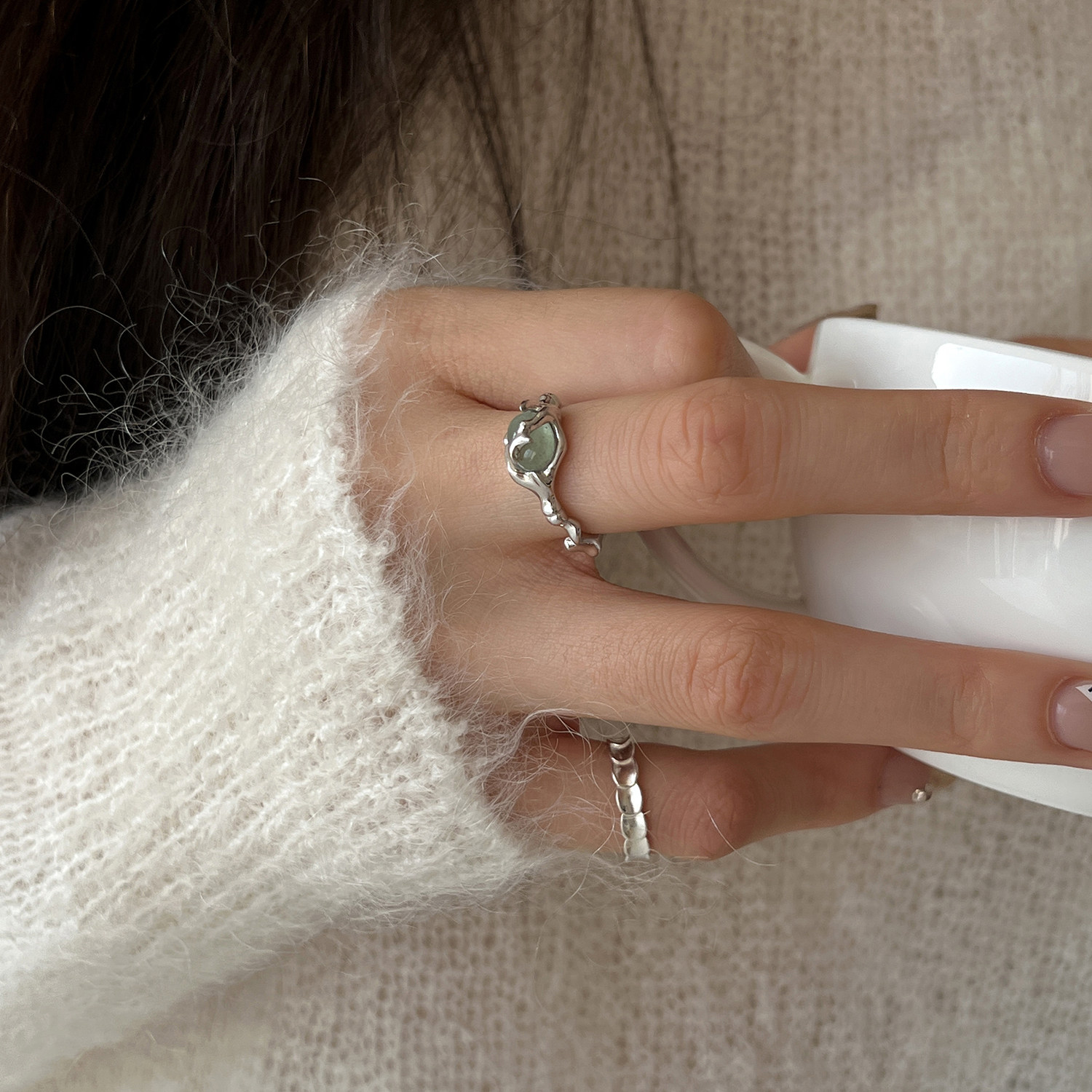 国潮新中式竹节戒指绿东陵玉S925纯银女戒指小众设计鳞片简约尾戒