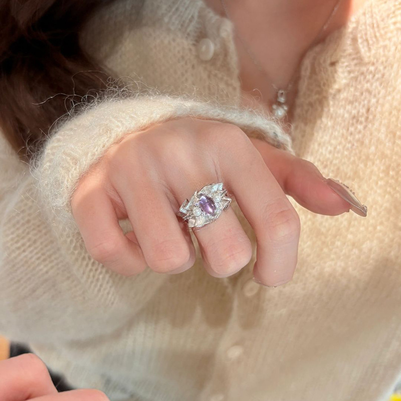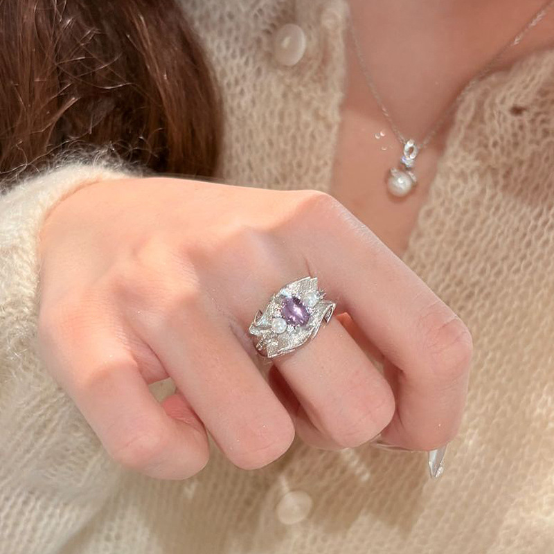 小红书爆款莫奈花园在逃公主珍珠紫裙戒指紫荆花鸽子蛋银色指环女