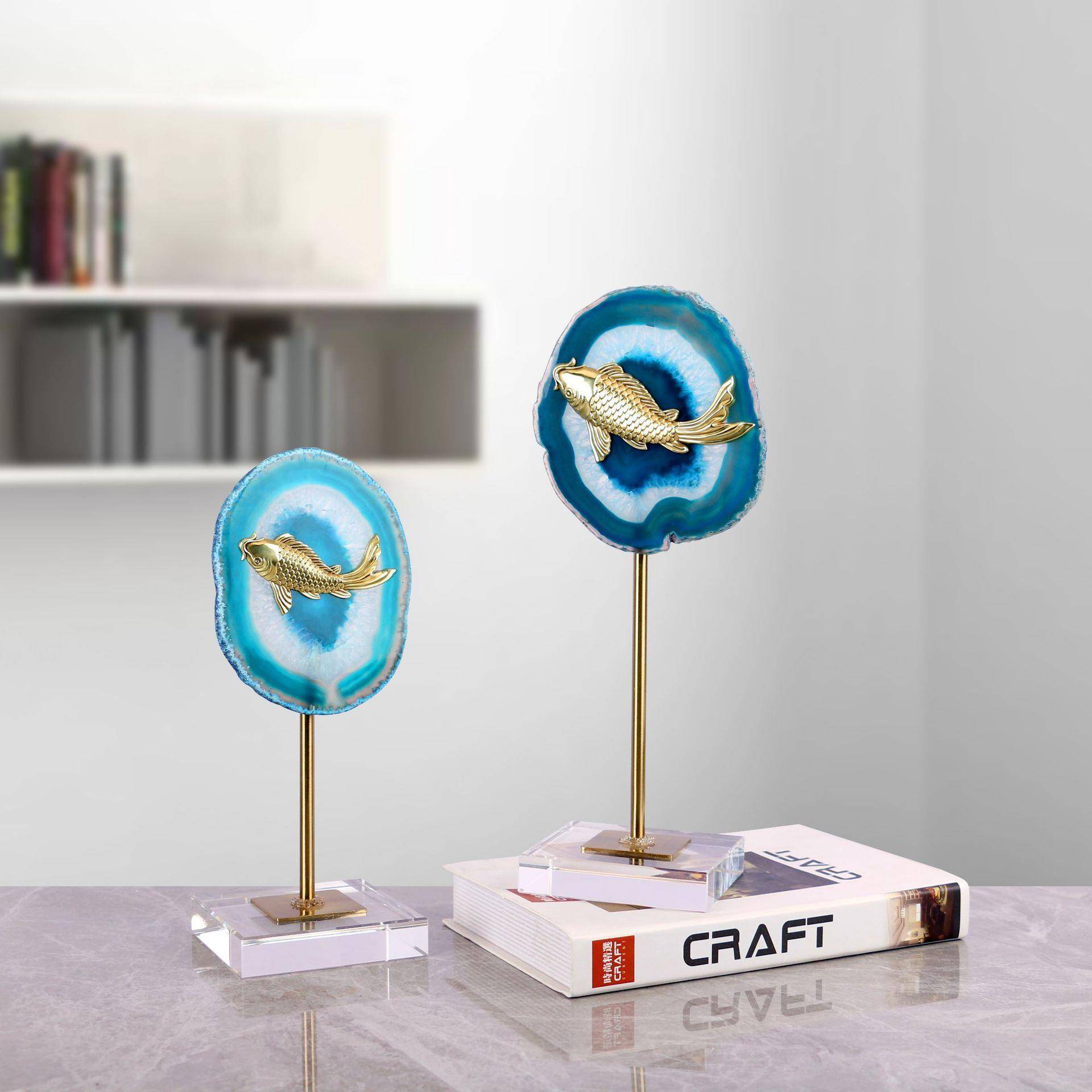 轻奢创意蓝色玛瑙片锦鲤透明水晶摆件北欧客厅玄关电视柜软装饰品