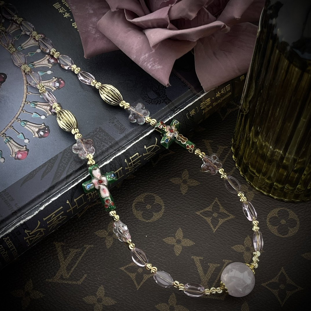 中古Vintage简约时尚甜美学生党琉璃珠子搭绿色珐琅十字架项链