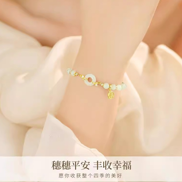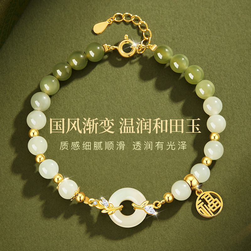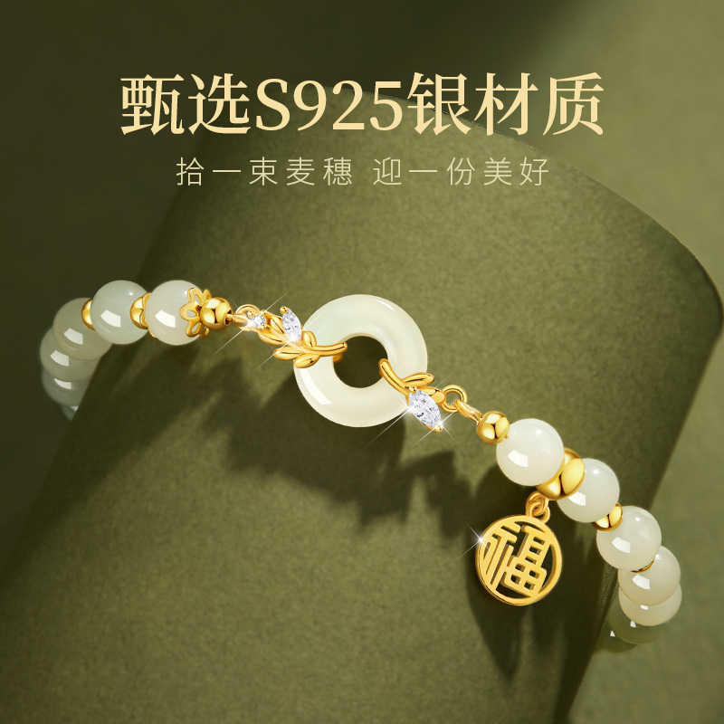 老凤祥S925银麦穗平安扣手链女轻奢古风福字牌和田玉手串生日礼物