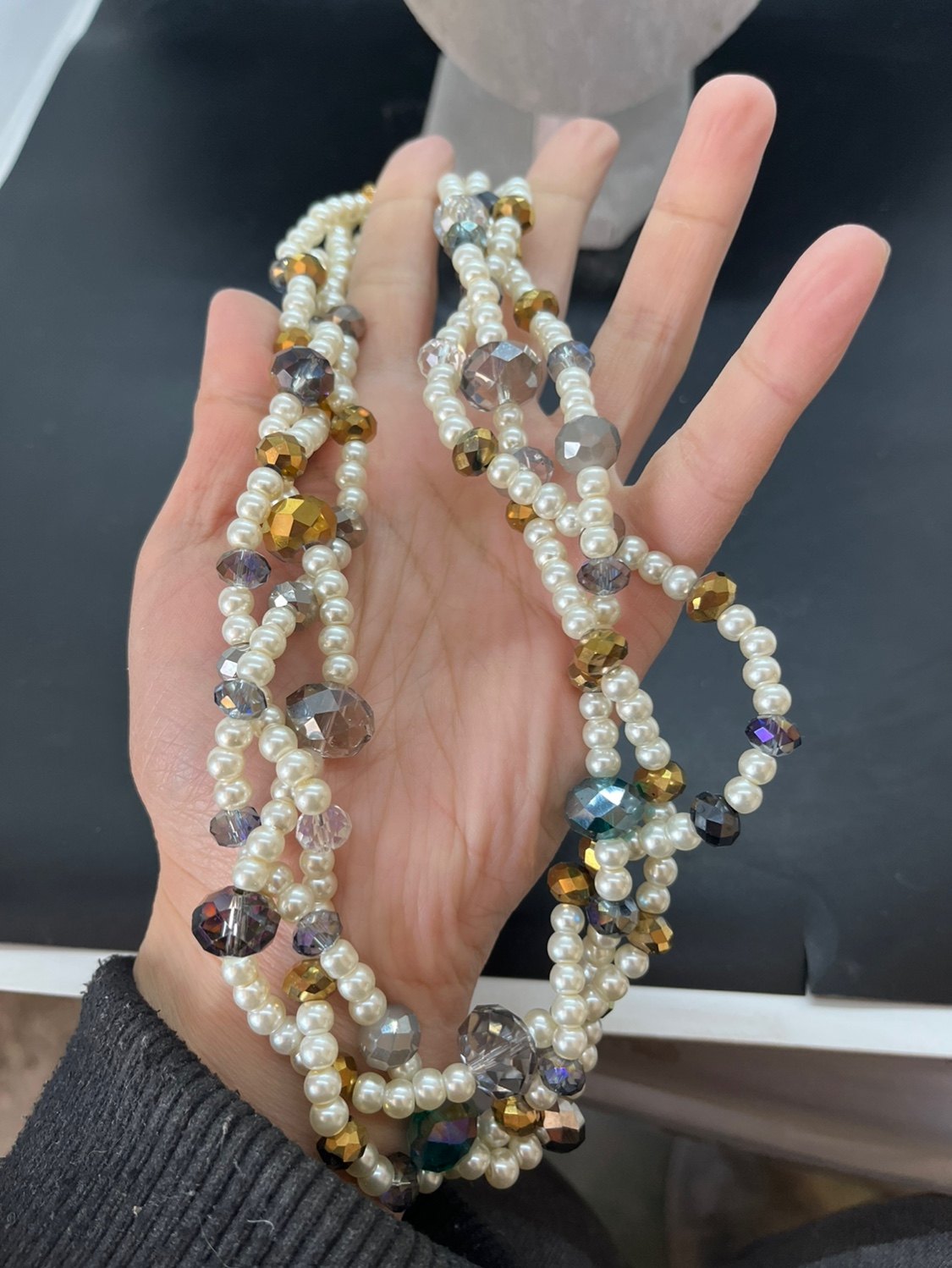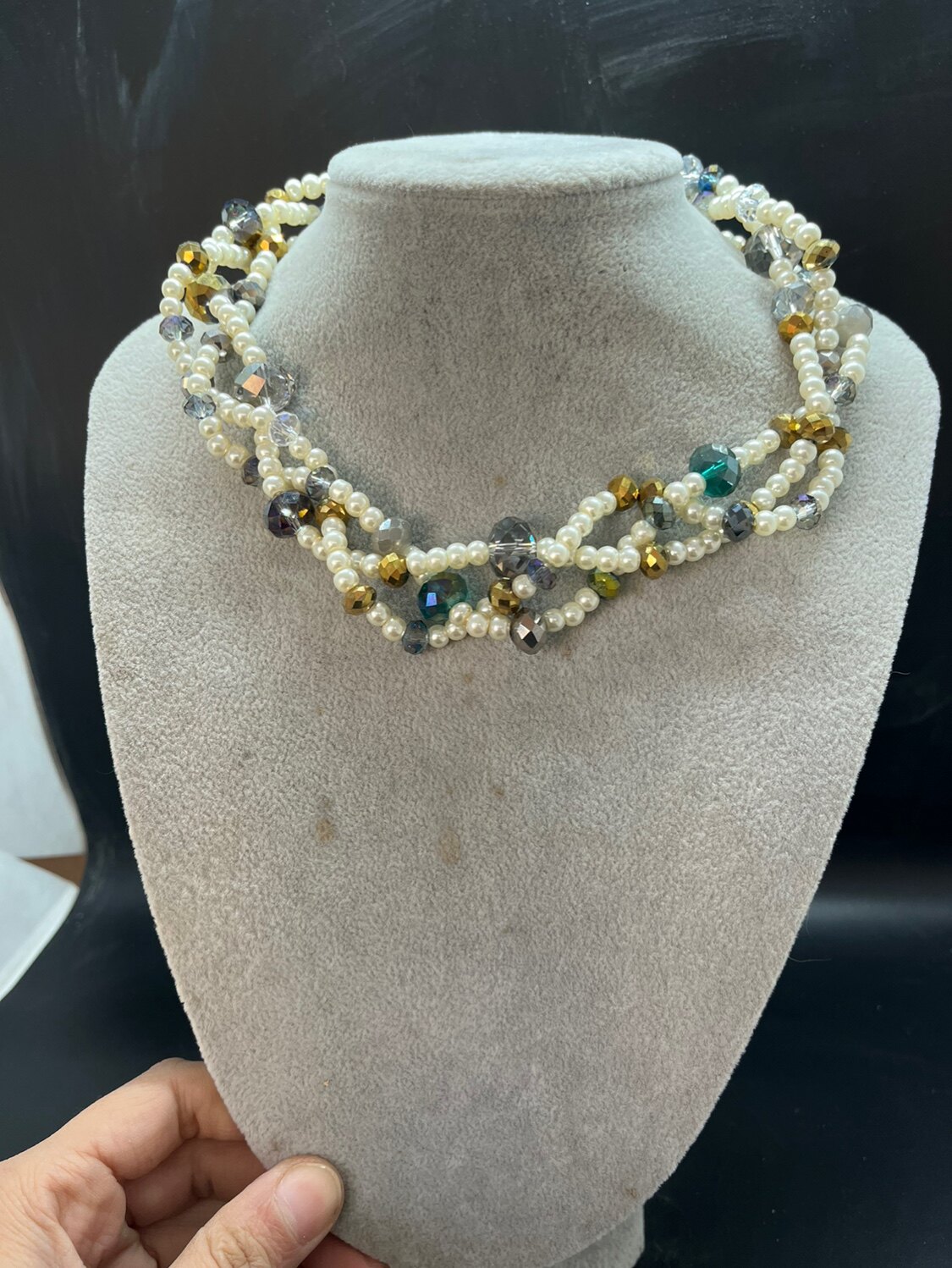三层白色琉璃珍珠短款项链金色捷克水晶珠项链麻花旋转