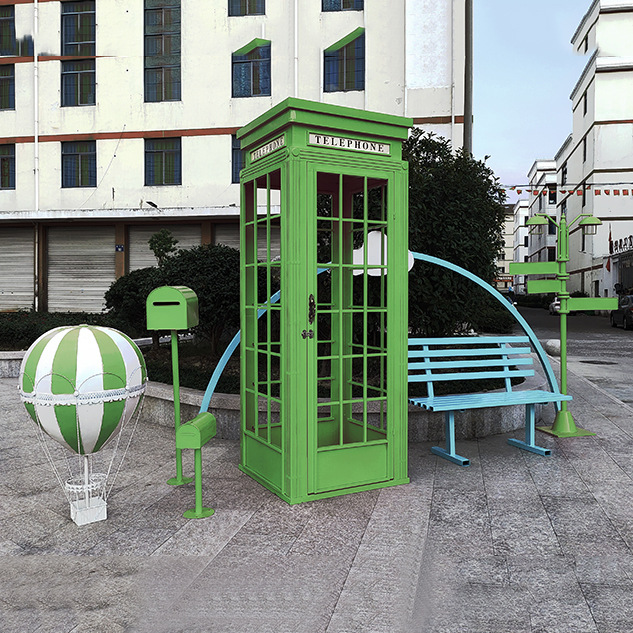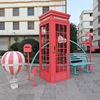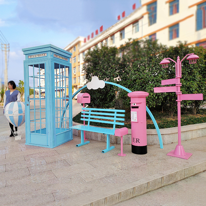复古英伦电话亭邮筒套装铁艺路牌指示牌景观双人长椅美陈摄影道具