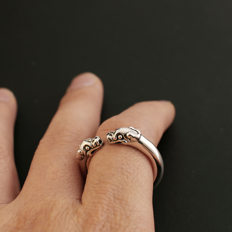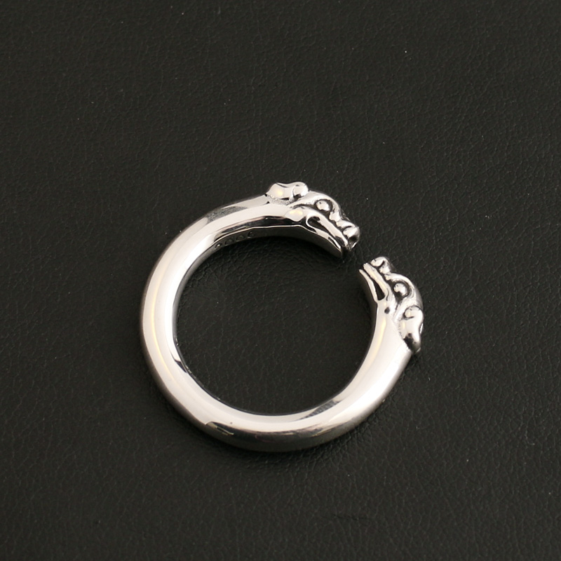 一休老银匠手工制作925纯银双龙头 狼头开口男女款潮流戒指