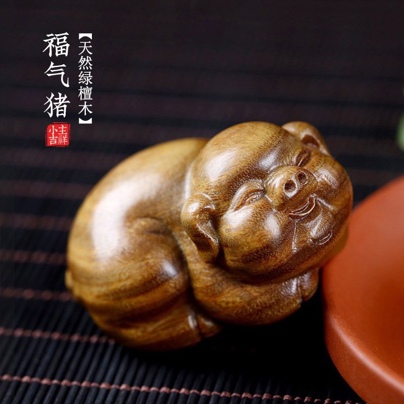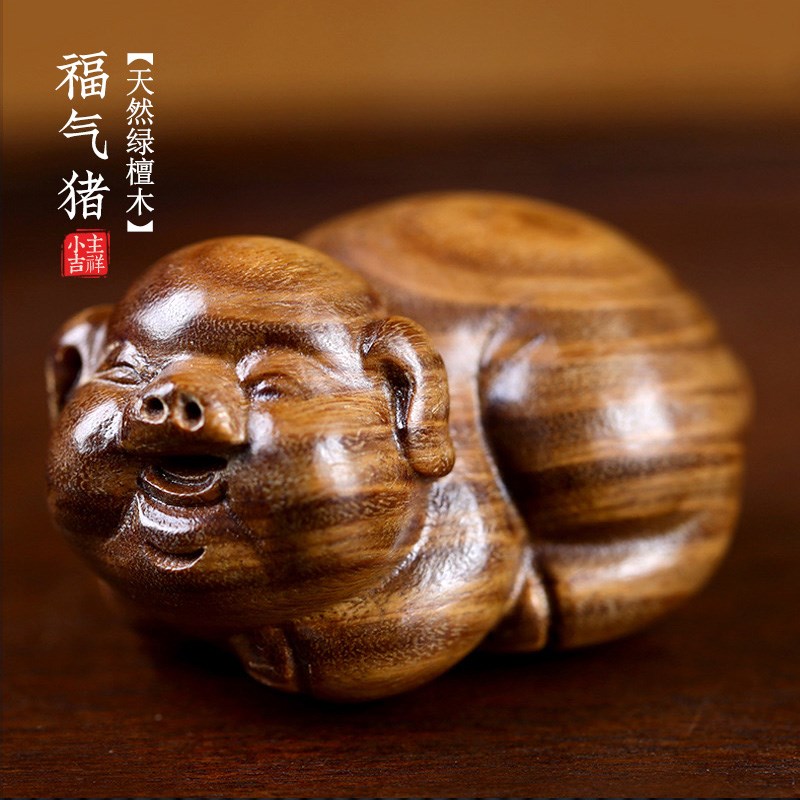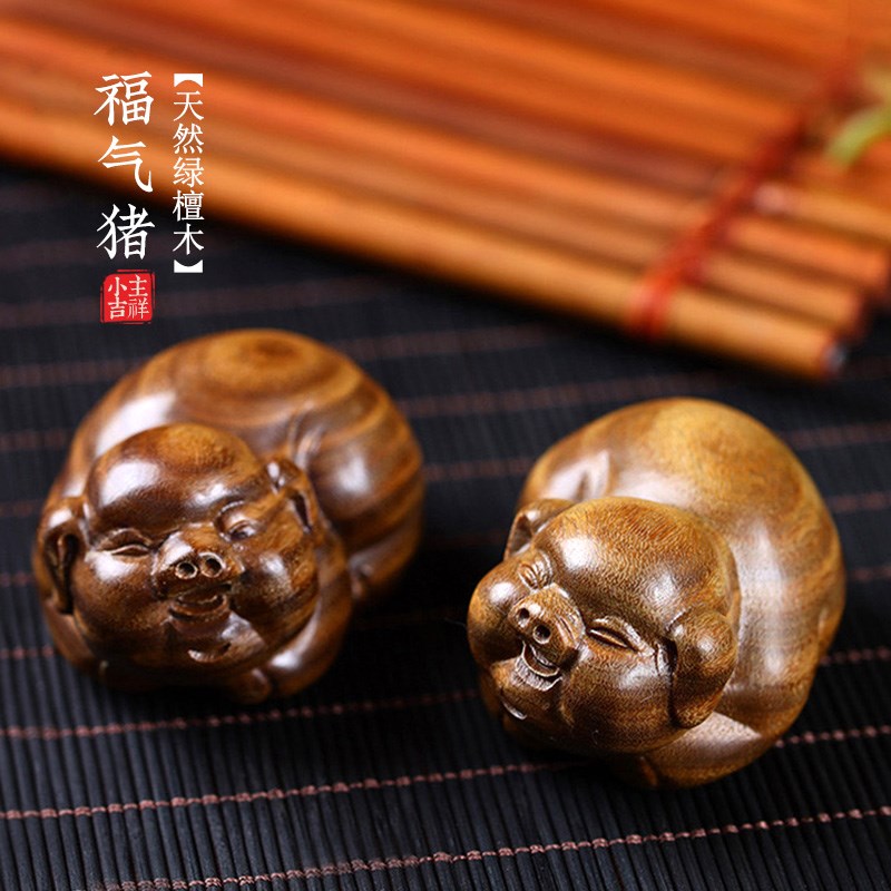 《福气猪》天然绿檀实木雕刻可爱摆件创意手把件生肖猪桌面工艺品