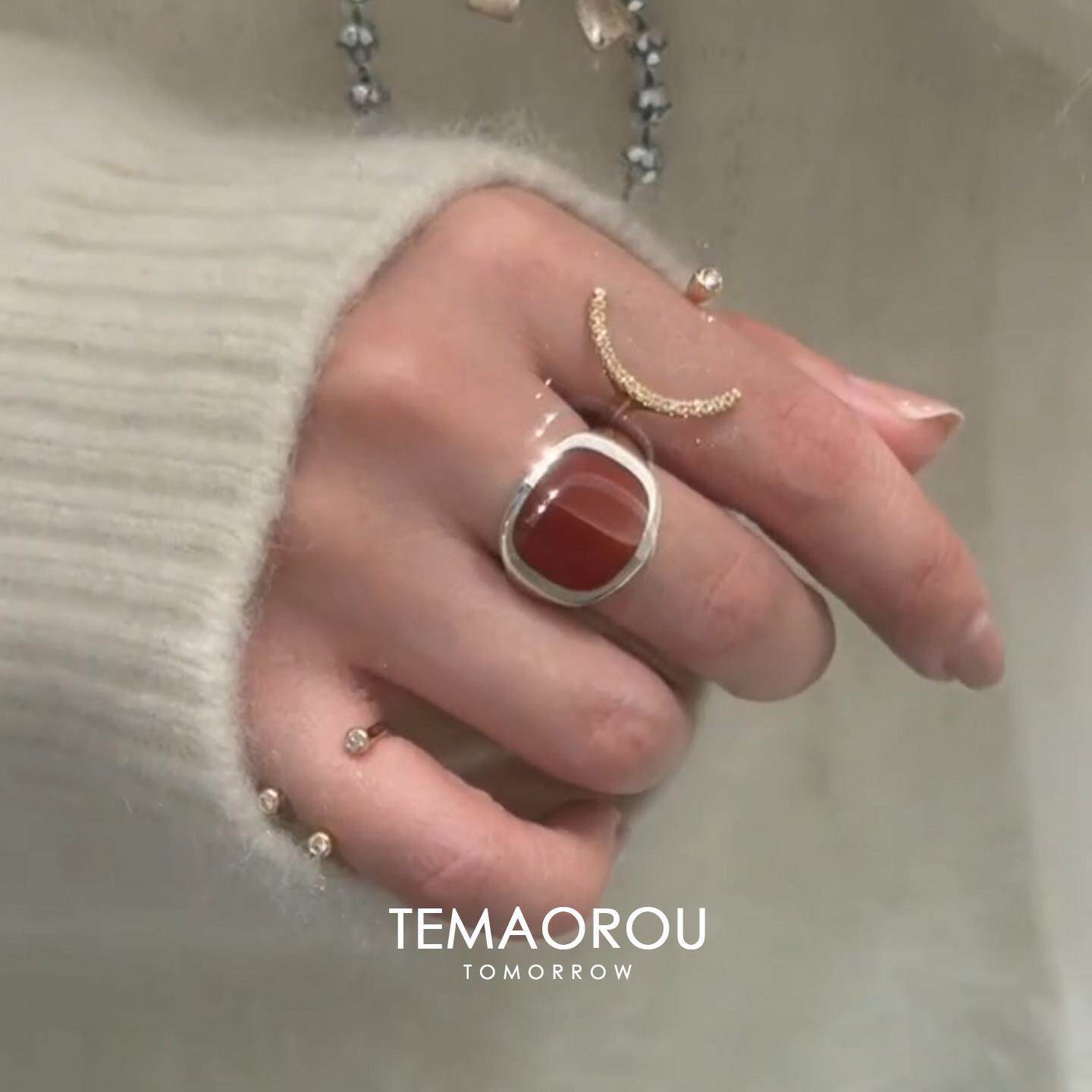 S925纯银日系复古红玛瑙宽口戒指女叠戴半月开口食指戒小拇指尾戒