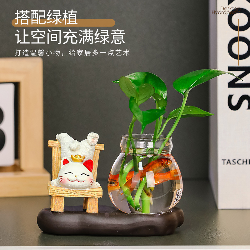 水培绿萝器皿招财猫办公桌面创意装饰解压公仔迷你绿植养殖玻璃瓶