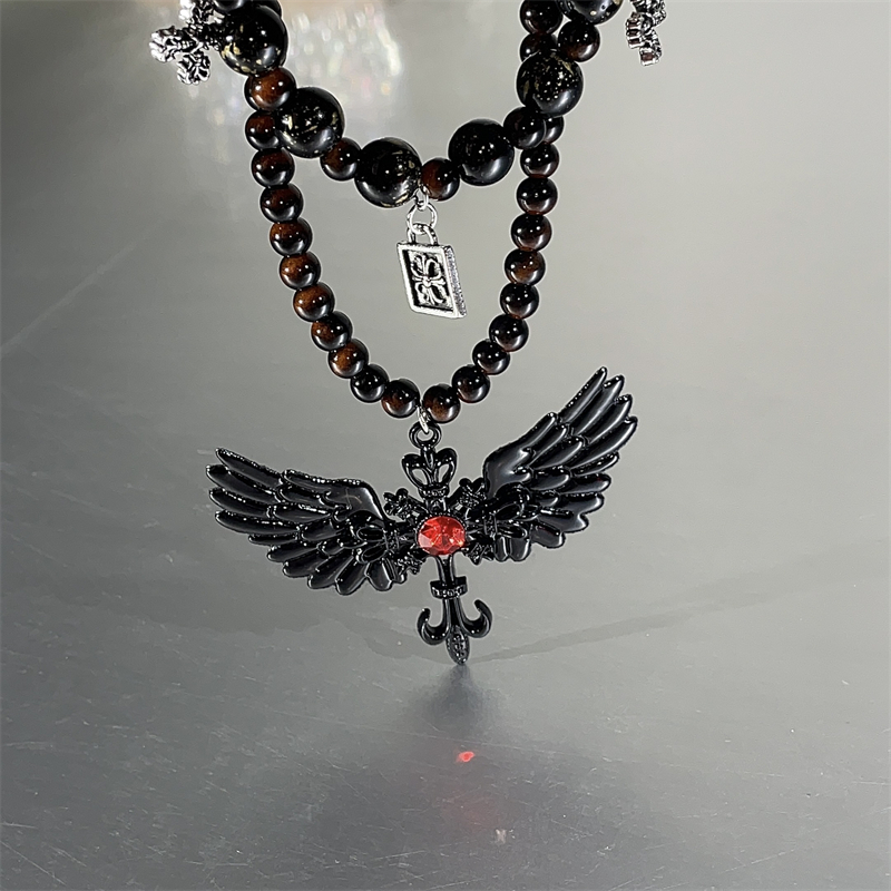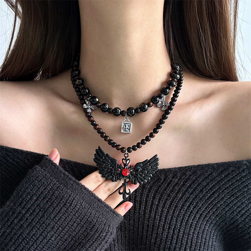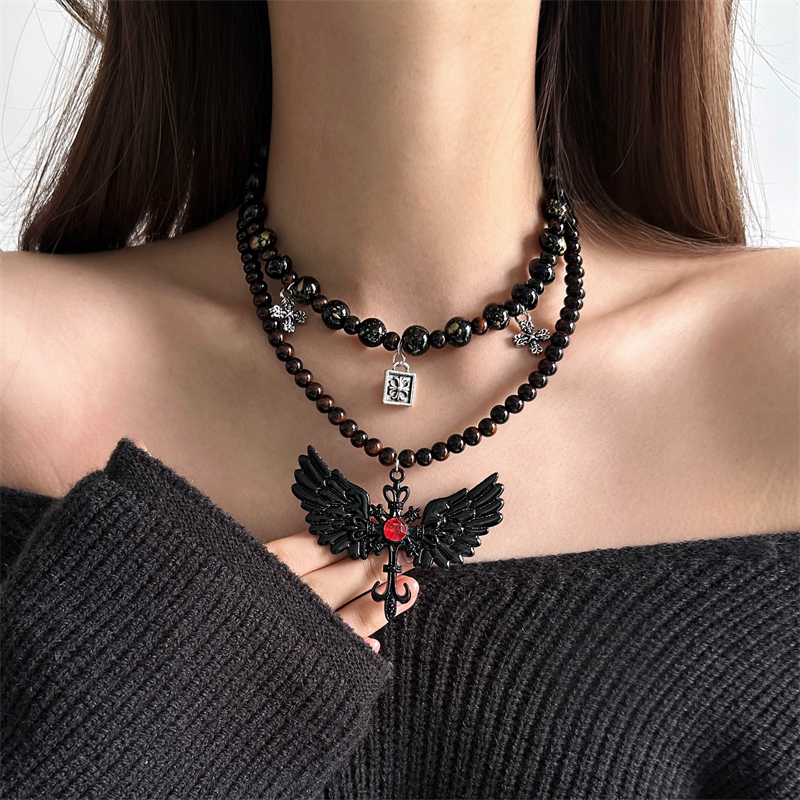 暗黑哥特风多层叠戴黑色珠子项链女复古十字架天使翅膀毛衣链配饰