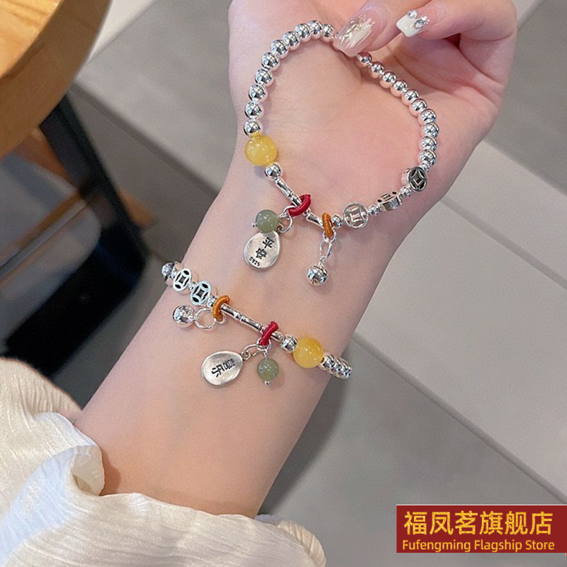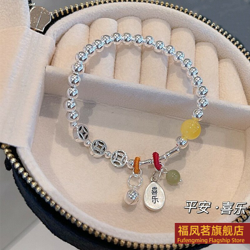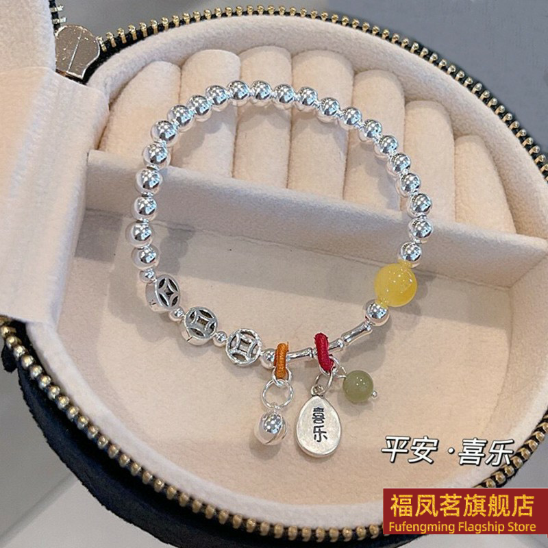 正生新款平安喜乐招财铜钱铃铛纯银手链女实心新款刻字银珠手串