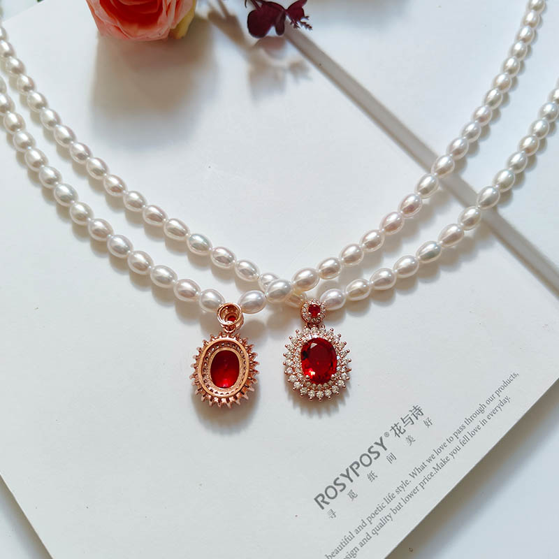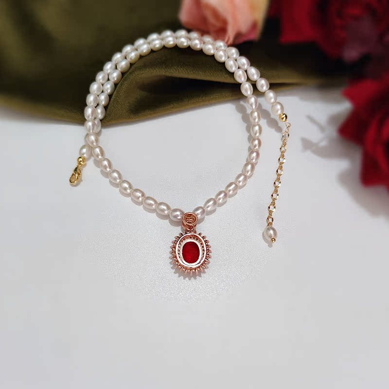 法式复古红宝石珍珠项链天然淡水轻奢小众女锁骨链耳环套装送礼物